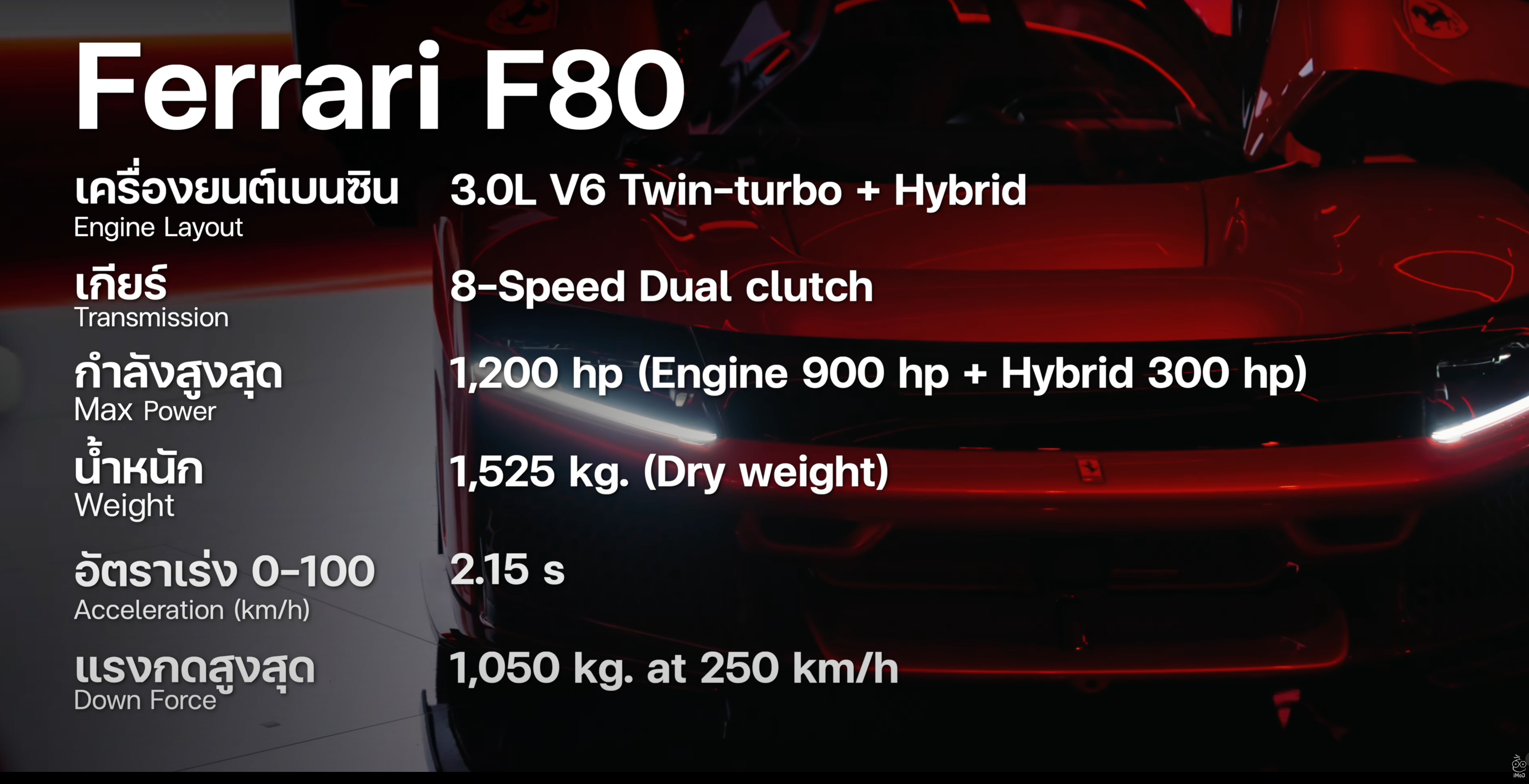 Ferrari F80 ไฮเปอร์คาร์ปลั๊กอินไฮบริดที่ใช้เทคโนโลยีจากทีมแข่ง Formula 1 ของ Ferrari ตัวเครื่องยนต์ถูกติดตั้งใกล้กับแผ่นใต้ท้องรถเพื่อให้จุดศูนย์ถ่วงต่ำลง นอกจากนี้ เครื่องยนต์ยังมีน้ำหนักเบาลงอีกด้วย หลัก Aerodynamic ที่ดีทำแรงกดให้รถได้สูงถึง 1,050 กก. ในย่านความเร็ว 250 กม./ชม.