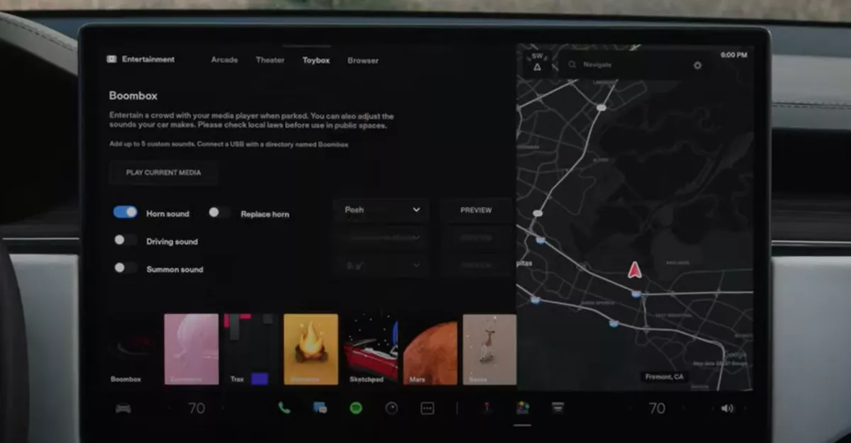 การเรียกใช้แอปพลิเคชั่น > กล่องของเล่น Tesla > โหมดการทดสอบการปล่อยมลพิษ ซึ่งคุณสามารถใช้ฟีเจอร์นี้เปลี่ยนเสียงสัญญาณไฟเลี้ยวให้เป็นเสียงผายลมได้ด้วย