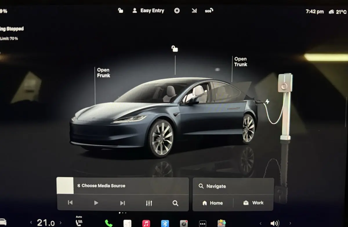 Tesla ได้เพิ่มภาพเคลื่อนไหวของเครื่องชาร์จ เมื่อรถจอดและเสียบปลั๊กชาร์จ ในภาพตัวอย่างนี้ เจ้าของใช้เครื่องชาร์จที่ไม่ใช่ของ Tesla จึงแสดงเป็นภาพเครื่องชาร์จทั่วไป คาดว่า Tesla จะแสดงเป็นภาพ Mobile Charger, Wall Connector หรือ Supercharger หากมีการเสียบปลั๊กเหล่านั้นเข้ากับรถ
