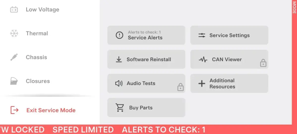 Tesla ได้เพิ่มปุ่ม Buy Parts ใน Service Mode (โหมดบริการ) ของ Tesla การแตะปุ่มนี้จะแสดงรหัส QR ที่นำผู้ใช้ไปยังเว็บไซต์บริการของ Tesla ซึ่งเจ้าของสามารถซื้ออะไหล่ได้โดยตรงจาก Tesla อะไหล่สามารถจัดส่งตรงไปยังลูกค้า หรือไปยังศูนย์บริการที่ใกล้ที่สุดได้