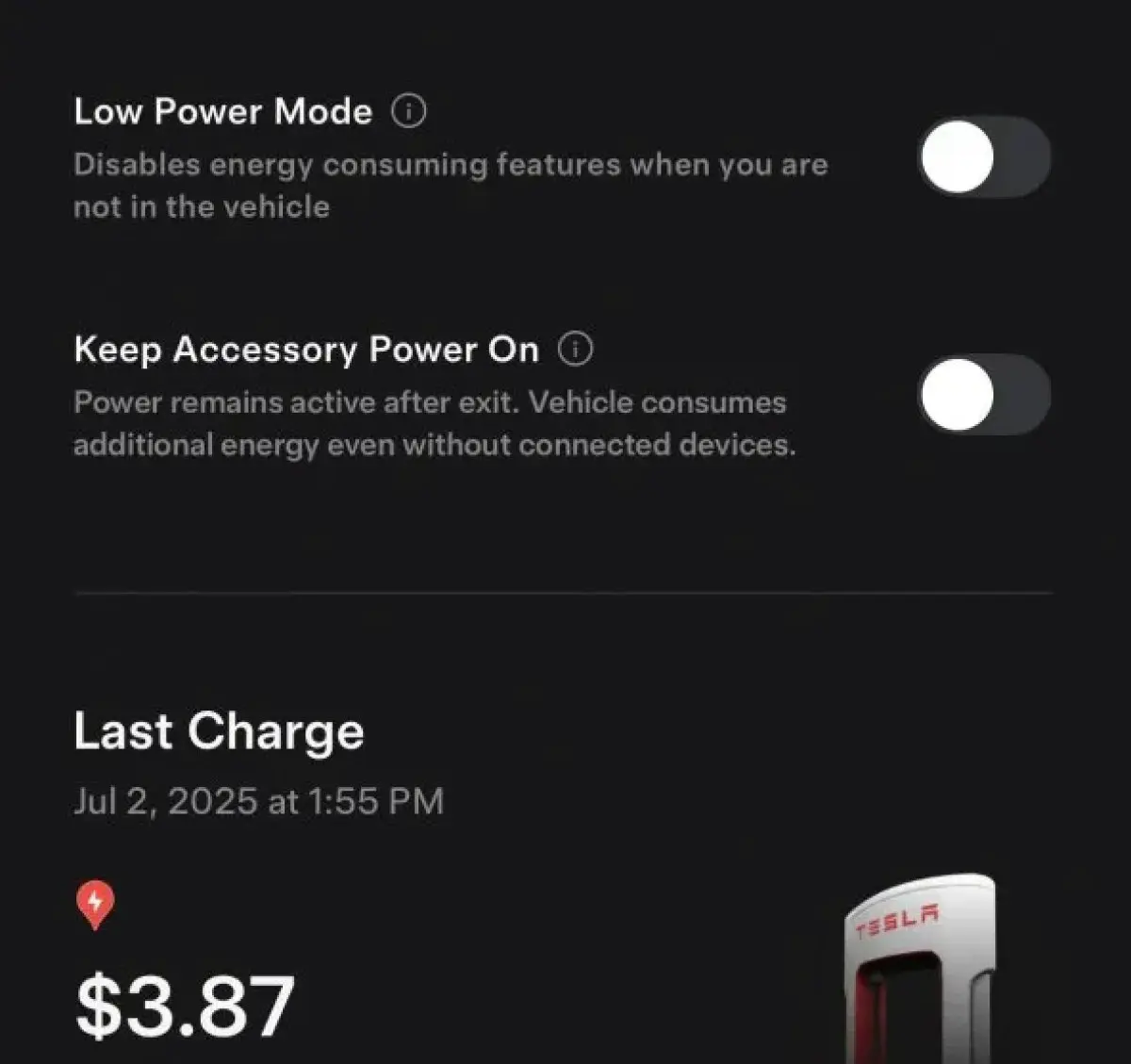 อัปเดตซอฟต์แวร์ 2025.38 ยังรองรับตัวเลือก ‘Keep Accessory Power On’ (เปิดไฟเลี้ยงอุปกรณ์เสริมไว้) ในแอปพลิเคชัน Tesla เวอร์ชันล่าสุด ตัวเลือกนี้เป็นส่วนหนึ่งของการอัปเดตแอปพลิเคชัน Tesla ล่าสุด ซึ่งเพิ่มเมนู Charging ใหม่ที่รวมตัวเลือกการชาร์จส่วนใหญ่ไว้ในเมนูเดียว