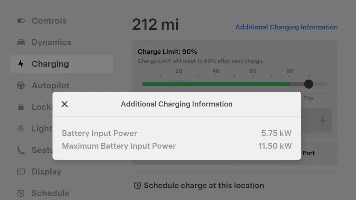ขณะที่รถกำลังชาร์จ Tesla จะเพิ่มลิงก์สำหรับ ‘Additional Charging Information’ (ข้อมูลการชาร์จเพิ่มเติม) ในส่วน Controls > Charging (การควบคุม > การชาร์จ) หากรถกำลังชาร์จ ลิงก์จะปรากฏเป็นสีน้ำเงินที่มุมบนขวา การแตะลิงก์จะแสดงหน้าต่างป๊อปอัพที่มีข้อมูลเพิ่มเติม เช่น กำลังไฟสูงสุดที่เข้าสู่แบตเตอรี่ (Maximum Battery Input Power) และ กำลังไฟที่เข้าสู่แบตเตอรี่ปัจจุบัน (Battery Input Power)