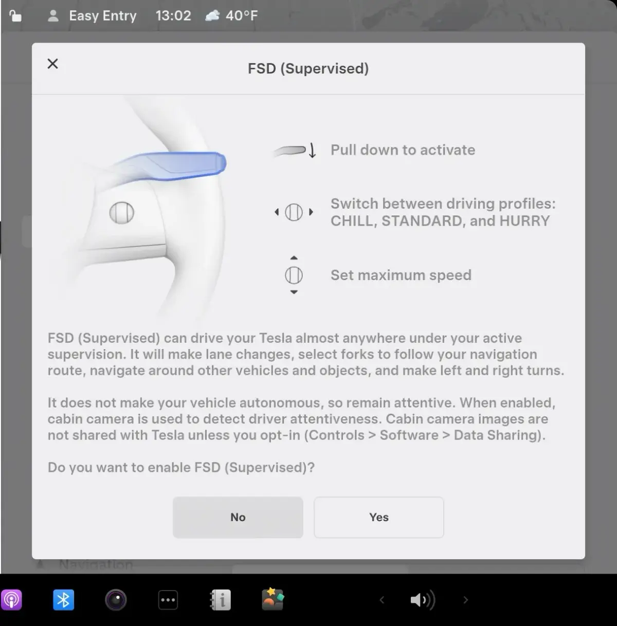 เมื่อผู้ใช้เปิดใช้งาน FSD จากเมนู Controls > Autopilot (การควบคุม > ระบบขับเคลื่อนอัตโนมัติ) Tesla จะแสดงคู่มือแนะนำ FSD แบบเต็มหน้าจอ คู่มือนี้มีข้อความเตือนความรับผิดชอบ (Disclaimer) แบบเดียวกับอัปเดตก่อนหน้า