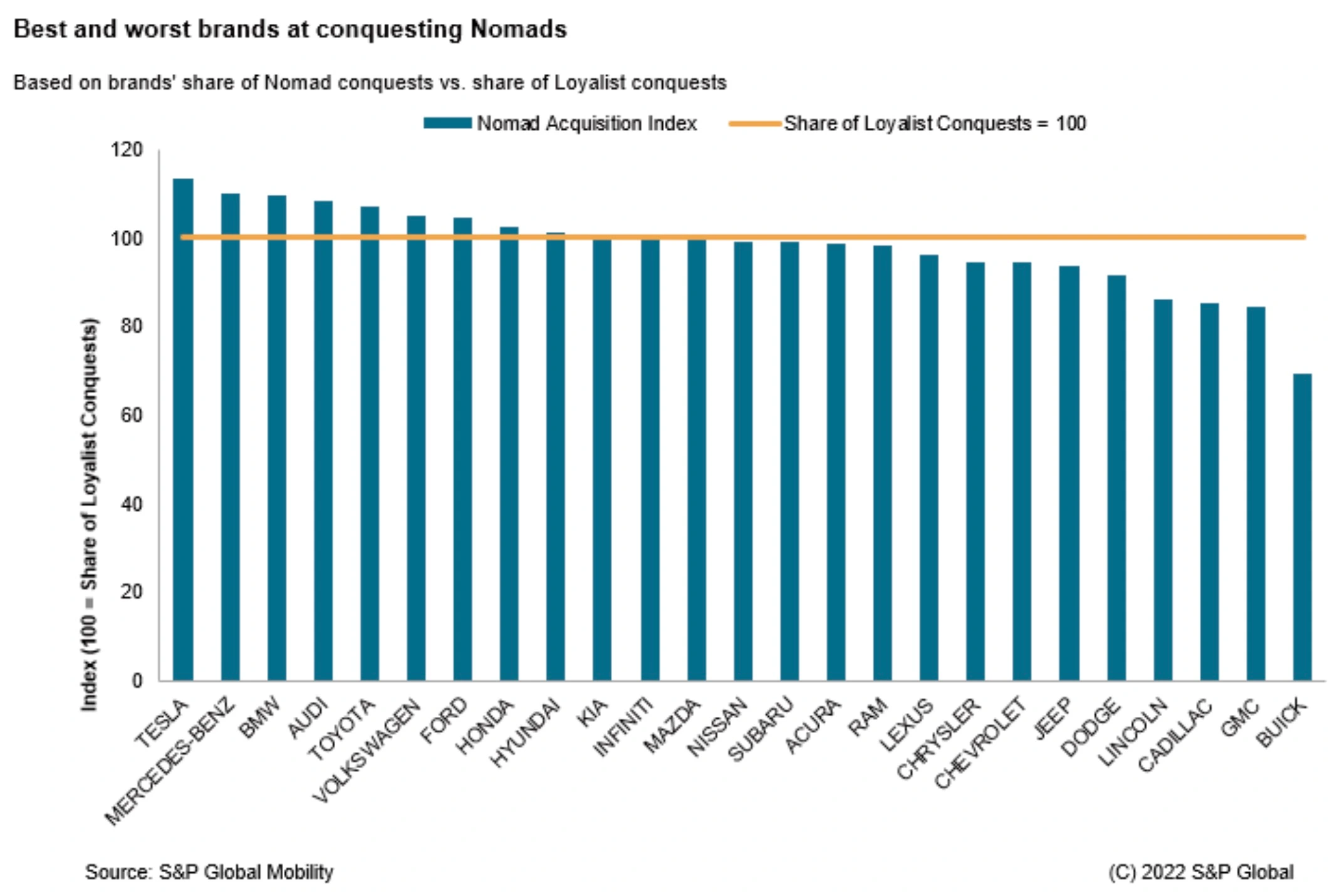 จากผลการศึกษาอันน่าสนใจของ S&P Global พบว่า มีกลุ่มผู้ซื้อรถประเภท ‘Nomad’ เรียกว่า ‘ผู้ซื้อเร่ร่อน’ ซึ่งอธิบายว่าเป็นคนที่ซื้อและใช้รถยนต์ยี่ห้อใดยี่ห้อหนึ่งเป็นครั้งแรกและเลือกซื้อยี่ห้ออื่นหลังจากได้ซื้อแค่ครั้งเดียว