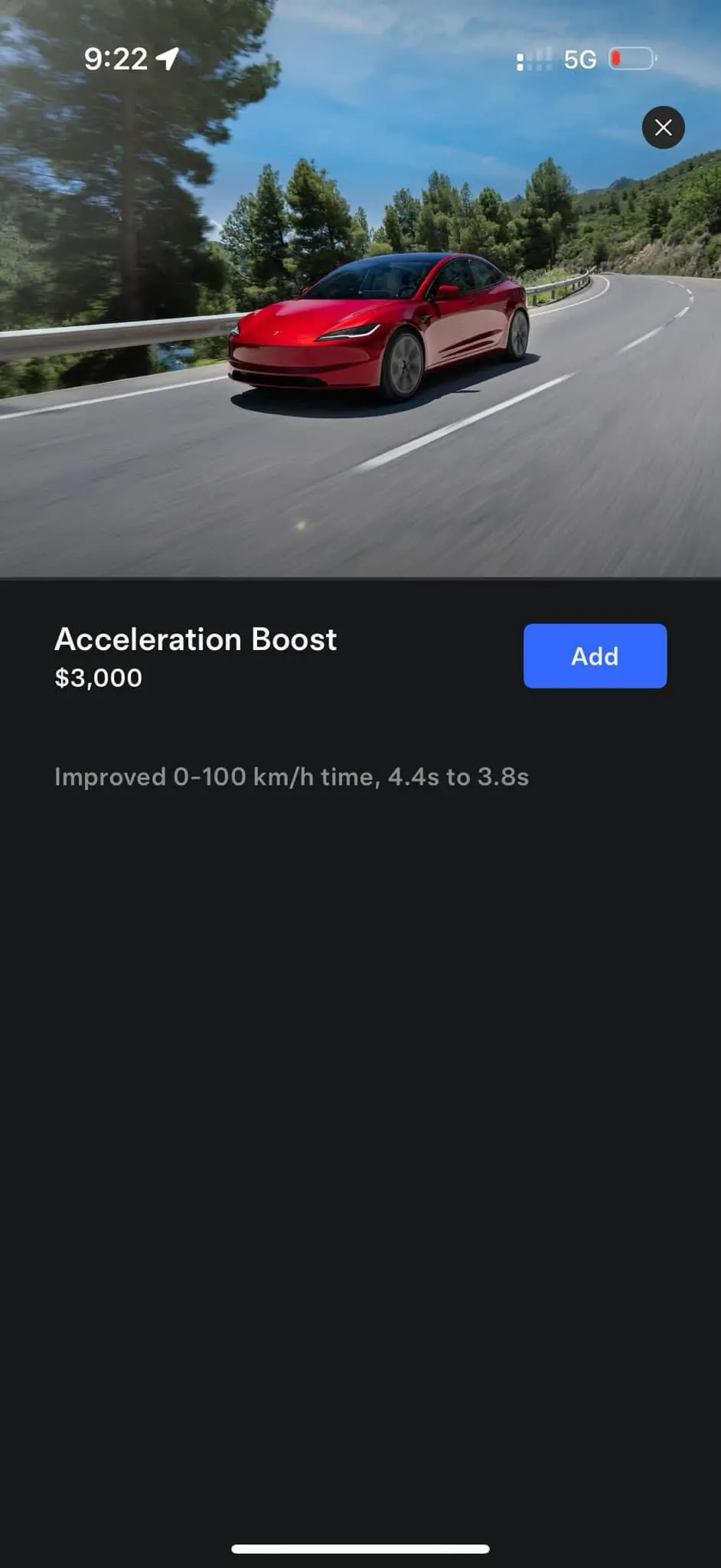 ผู้ใช้ Tesla Model 3 AWD ในประเทศออสเตรเลียและจีน สามารถซื้อโปรแกรม Acceleration Boost ผ่านแอปพลิเคชัน Tesla บนมือถือหรือเว็บไซต์ Tesla ได้เลย มีราคาอยู่ที่ 3,000 ดอลลาร์ออสเตรเลีย (ประมาณ 67,000 บาท) ซึ่งถือว่าราคาถูกว่าการอัปเกรดรถเป็น Model 3 Performance