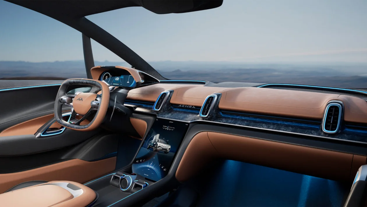 ด้วยฐานล้อ 3,025 มม. ทำให้ Aehra มีพื้นที่เพียงพอสําหรับผู้ใหญ่สูง 5 คน โดยมีรูปแบบทั้งแบบ 4 และ 5 ที่นั่ง เบาะนั่งด้านหน้าและหลังสามารถเอนได้ ผู้โดยสารจะได้รับการต้อนรับด้วยหน้าจอขนาดใหญ่แสดงข้อมูลความเร็ว การนําทาง รวมถึงสภาพอากาศระหว่างการขับขี่