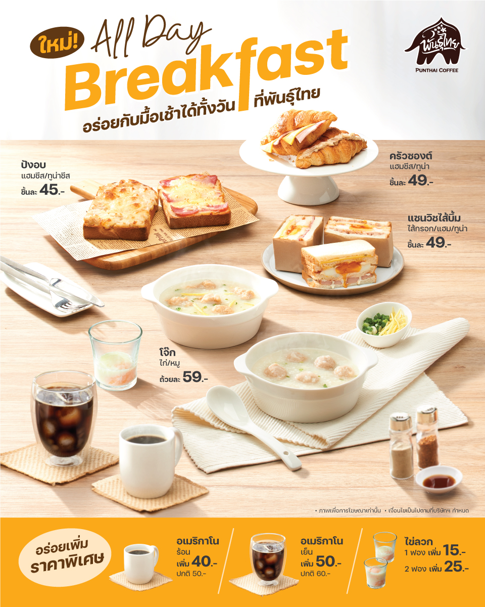 อร่อยกับมื้อเช้าได้ทั้งวันที่พันธุ์ไทย ไม่ว่ามื้อไหน ๆ ก็อิ่มฟิน สะดวกสบายได้ทุกเวลา กับหลากหลายเมนูยอดนิยม ทั้งปังอบแฮมชีส/ทูน่าชีส 45.- ครัวซองแฮมชีส/ทูน่า 49.- แซนวิชไส้บึ้มไส้กรอก/แฮม/ทูน่า 49.- และเมนูหอมกรุ่นสุดฮิตอย่าง โจ๊กไก่/หมู 59.- พิเศษ! เพิ่มความฟินด้วยไข่ลวกร้อน ๆ เพียง 15.- หรือทานคู่กับเครื่องดื่มขวัญใจมหาชนอย่าง อเมริกาโนร้อน ในราคาพิเศษเพียง 40.- จากปกติ 50.- สำหรับสายชิลล์เพิ่มอเมริกาโนเย็นเพียง 50.- จากปกติ 60.- อิ่มอร่อยครบจบมื้อในราคาสุดคุ้ม