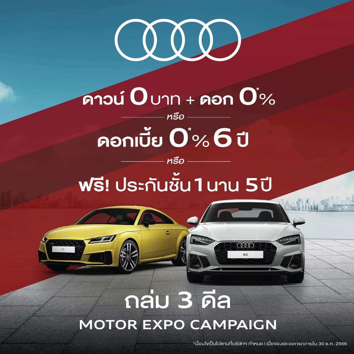 และ Q3 ช่วงปลายปีงาน Motor Expo ถือเป็นกิจกรรมทางการตลาดที่สำคัญที่ลูกค้ารอคอย อาวดี้ได้นำรถรุ่นใหม่ล่าสุดและรุ่นยอดนิยมมาจัดแสดงในงานรวมกว่า 20 รุ่น พร้อมแคมเปญส่งเสริมการขายส่งท้ายปี 3 ทางเลือก ออกรถไม่ต้องดาวน์ ผ่อนไม่มีดอกเบี้ย หรือ ดอกเบี้ย 0% สูงสุด 6 ปี หรือเลือกรับฟรี ประกันภัยชั้นหนึ่ง นาน 5 ปี นับเป็นโอกาสดีสำหรับลูกค้าที่ชื่นชอบเครื่องยนต์สันดาป ที่จะได้ชมรถยนต์ Audi ครบทุกเซกเมนต์ พลาดไม่ได้กับรถในตระกูล RS กับเทคโนโลยีที่ดีที่สุด พร้อมขุมพลังสมรรถนะสูง ถือเป็นการพัฒนาอย่างลงตัวและสมบูรณ์แบบที่สุด ทั้งเส้นสายดีไซน์ที่สวยงาม รูปลักษณ์ที่โดดเด่น ไม่เหมือนใครตามสไตล์ของอาวดี้