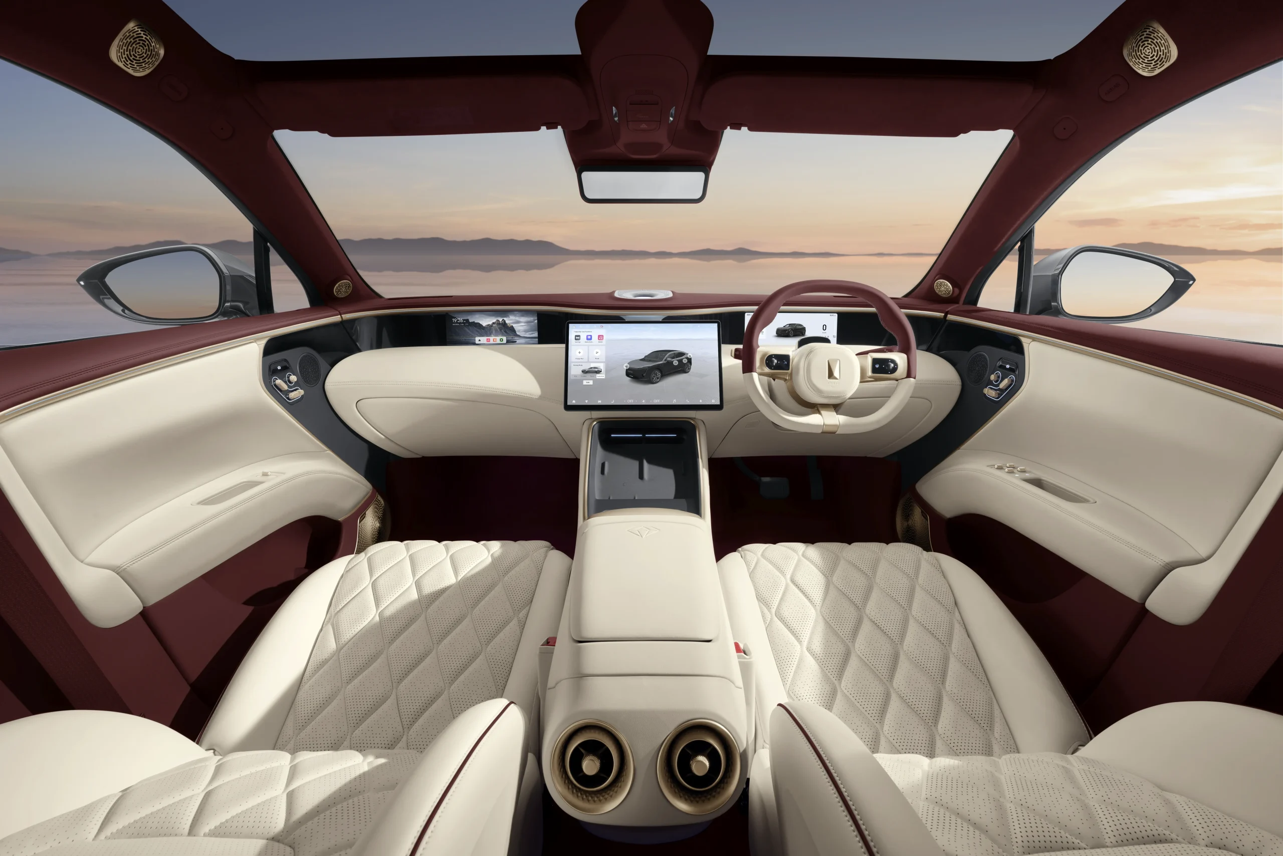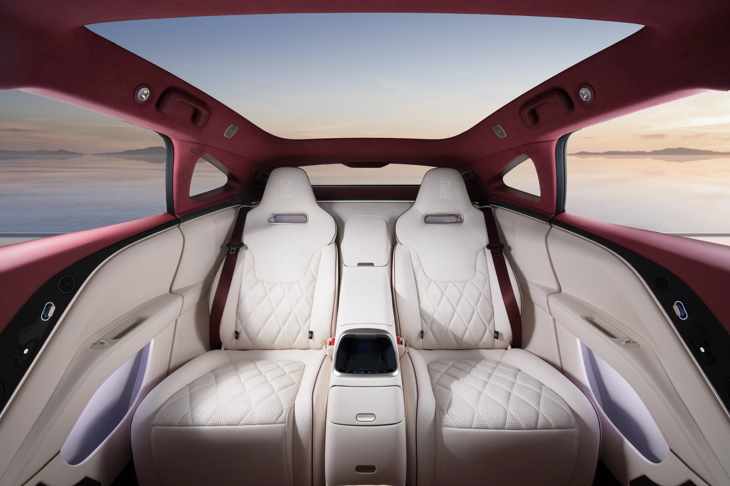 ภายในห้องโดยสารที่ออกแบบมาสำหรับผู้บริหารระดับสูงห้อมล้อมด้วยเพดานกำมะหยี่ Merlot Red Suede และหนังแท้แบบกึ่งอนิลิน (Semi-aniline leather) สี Rose-White พร้อมที่นั่ง VIP 4 ที่นั่ง รวมถึงพื้นที่พักผ่อนด้านหลังซึ่งมาพร้อมที่วางแขนแบบลอยตัว ฟังก์ชันนวด 8 จุด และระบบชาร์จไร้สาย 50 วัตต์ พร้อมการควบคุมด้วยระบบสัมผัส เรียกได้ว่ารังสรรค์ทุกรายละเอียดมาเพื่อยกระดับการเดินทางสู่ประสบการณ์ทรงพลังที่ทั้งปราณีตและสง่างาม