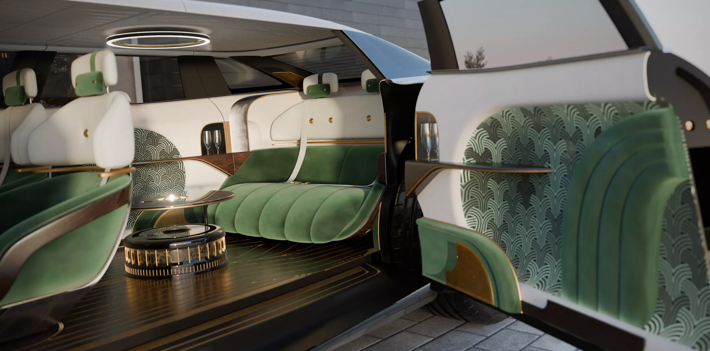 ภาภยในห้องโดยสารบอกลาการใช้ “เบาะหลังรถ” แบบเดิม ๆ ออกไป ปรับให้เป็นเลานจ์ส่วนตัวใช้โซฟาขนาดใหญ่ เก้าอี้พับได้ และตู้กลางที่สามารถซ่อนมินิบาร์ กล่องเก็บซิการ์ หรือเครื่องหมุนเรือนเวลาได้