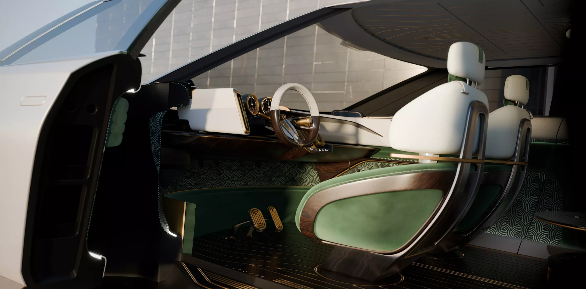 ภาภยในห้องโดยสารบอกลาการใช้ “เบาะหลังรถ” แบบเดิม ๆ ออกไป ปรับให้เป็นเลานจ์ส่วนตัวใช้โซฟาขนาดใหญ่ เก้าอี้พับได้ และตู้กลางที่สามารถซ่อนมินิบาร์ กล่องเก็บซิการ์ หรือเครื่องหมุนเรือนเวลาได้