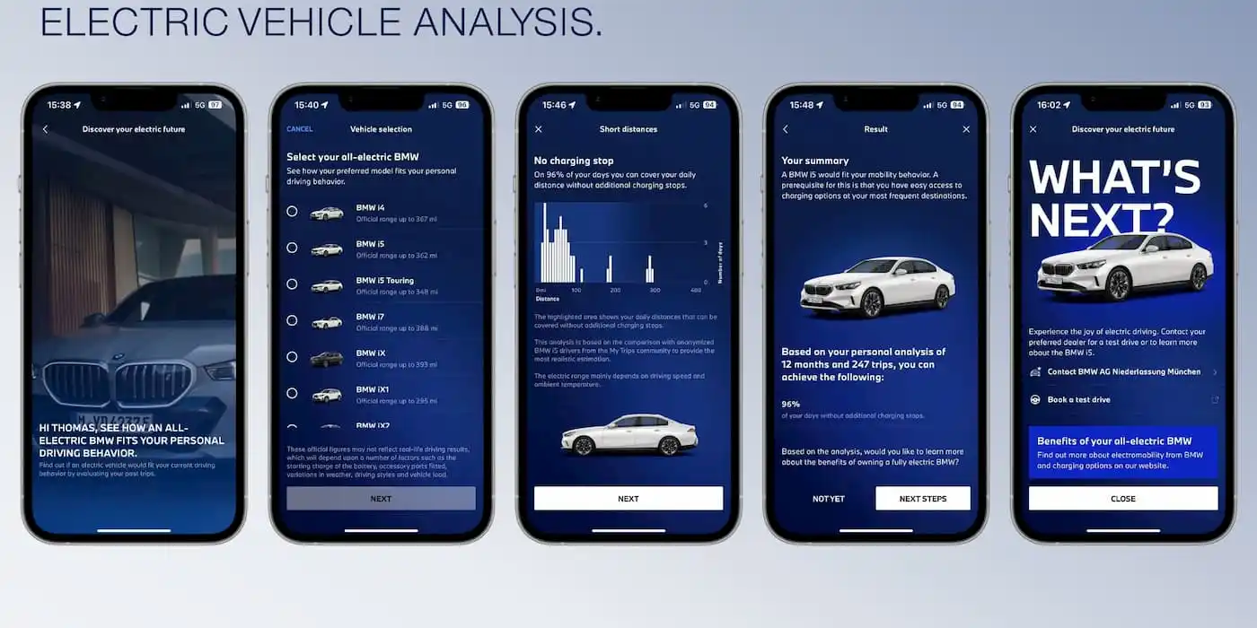 เครื่องมือวิเคราะห์รถยนต์ไฟฟ้าใหม่ช่วยให้ผู้ขับขี่ BMW ที่มีเครื่องยนต์สันดาปเพื่อดูว่ารถยนต์ไฟฟ้าจะทํางานอย่างไรในการเดินทางเดียวกัน ในการใช้งาน คุณสามารถเลือกรุ่นรถยนต์ไฟฟ้าของ BMW ที่คุณต้องการ “ทดสอบ” ในแอป