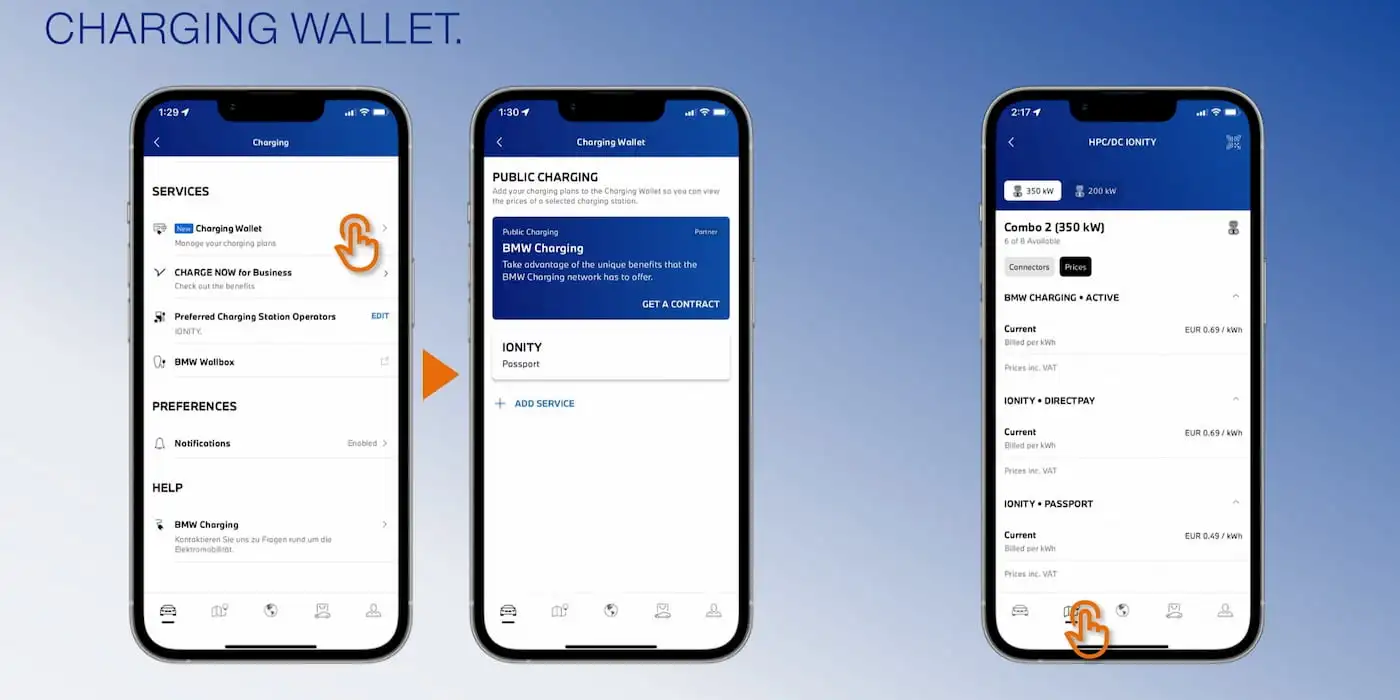 ผ่านการอัปเดตแอปของ BMW ผู้ขับขี่รถยนต์ไฟฟ้าสามารถจัดการการชําระเงินใน Charging Wallet ใหม่ได้แล้ว เมื่อเลือกจุดชาร์จแล้ว จะแสดงราคาและความพร้อมใช้งาน (คล้ายกับระบบของ Tesla)