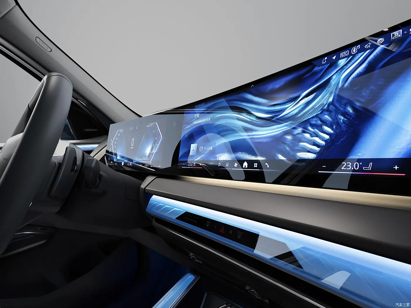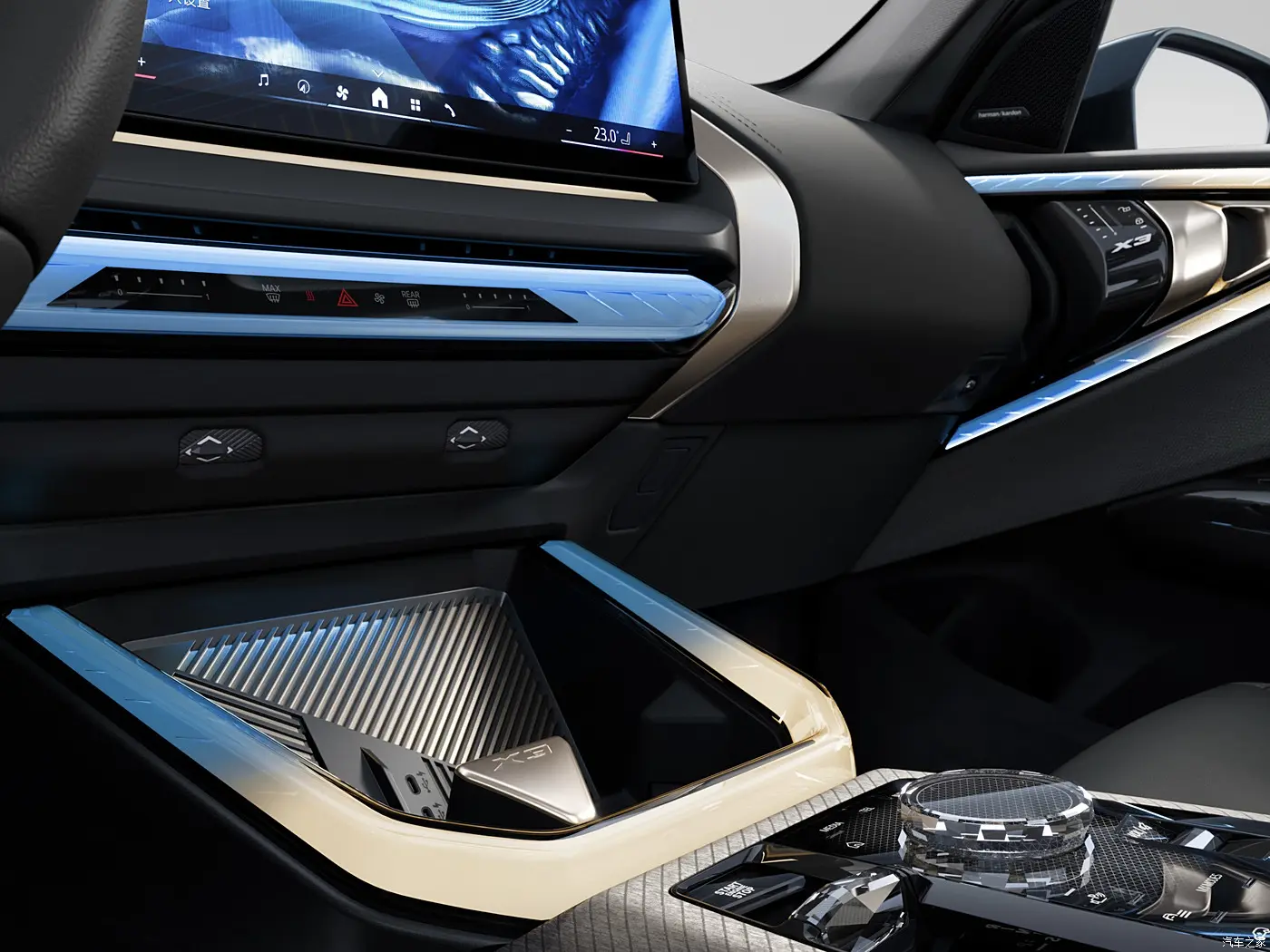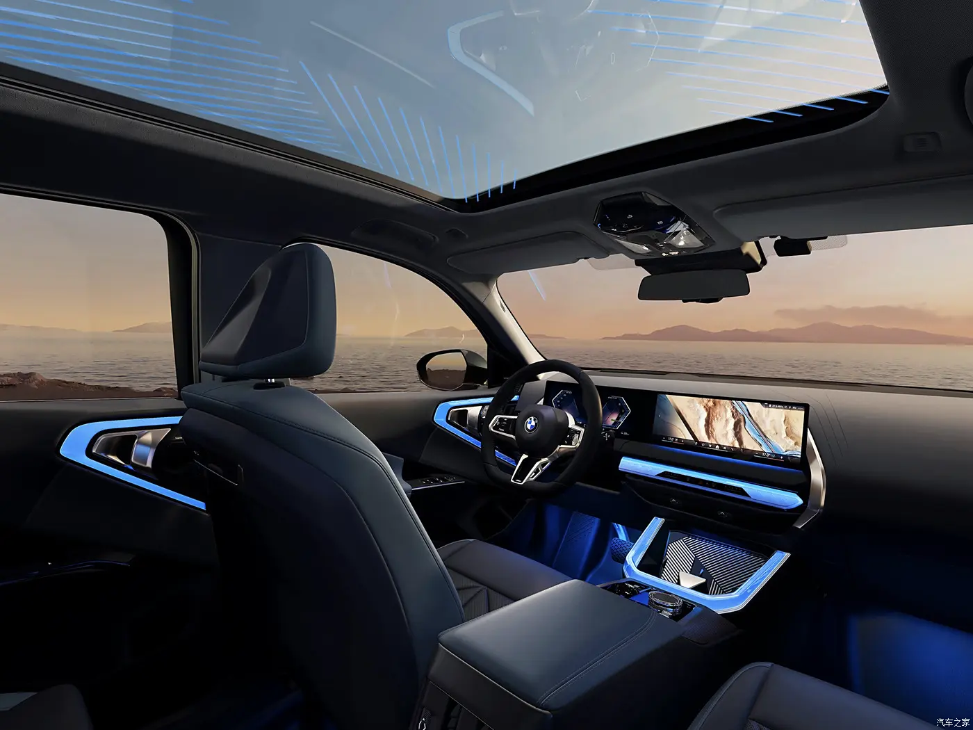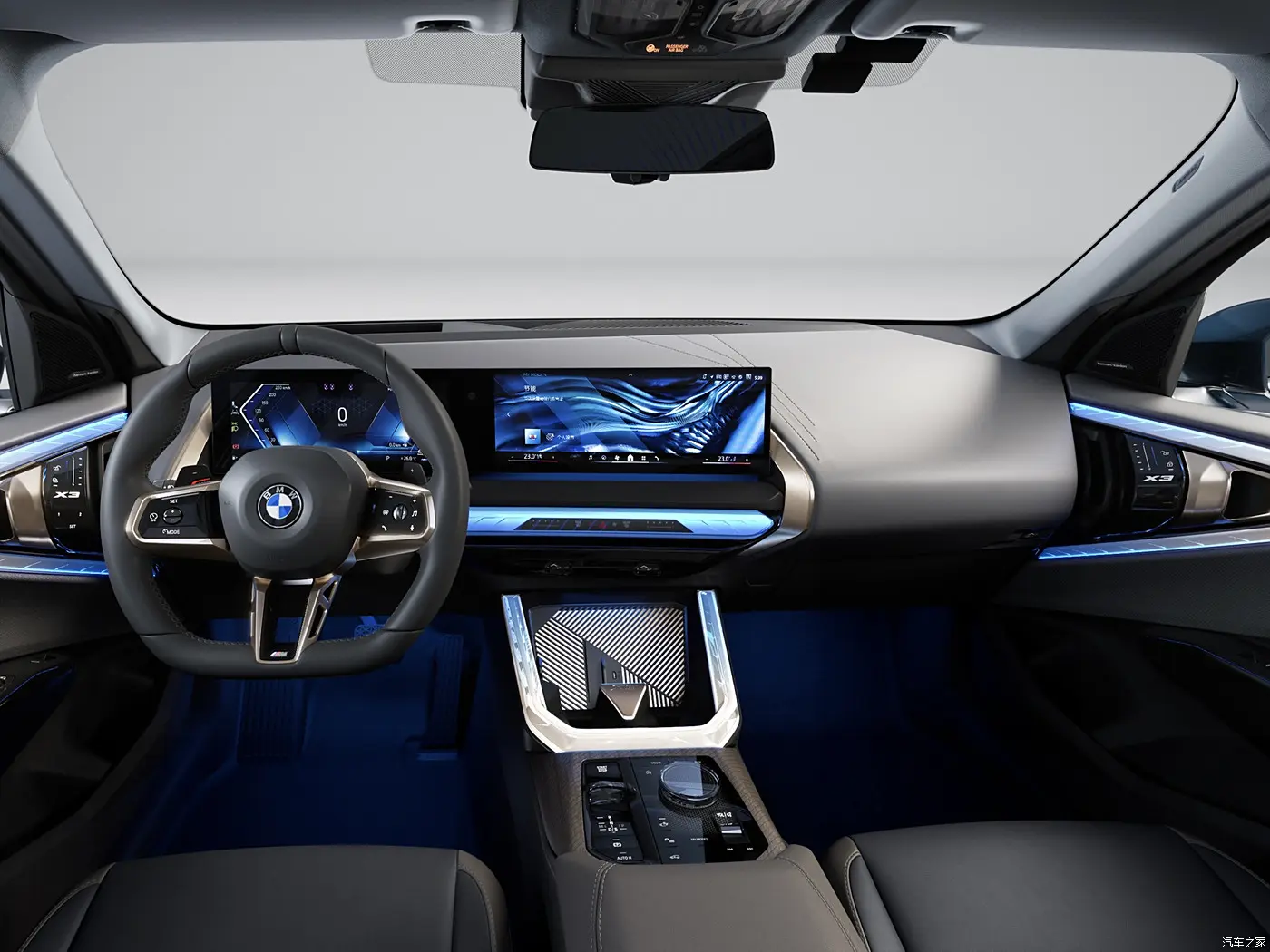 ภายในห้องโดยสารของ BMW X3 ใหม่ มาพร้อมหน้าจอแสดงผลแบบโค้ง BMW Curved Display ขนาด 12.3 + 14.9 นิ้ว พร้อมระบบปฏิบัติการ iDrive 9 infotainment system ไฟ Ambient Light ที่สามารถผสมผสานการแสดงออกสีที่แตกต่างกันได้ในแต่ละบริเวณ โดยเฉพาะบริเวณแผงประตูและคอนโซลหน้า