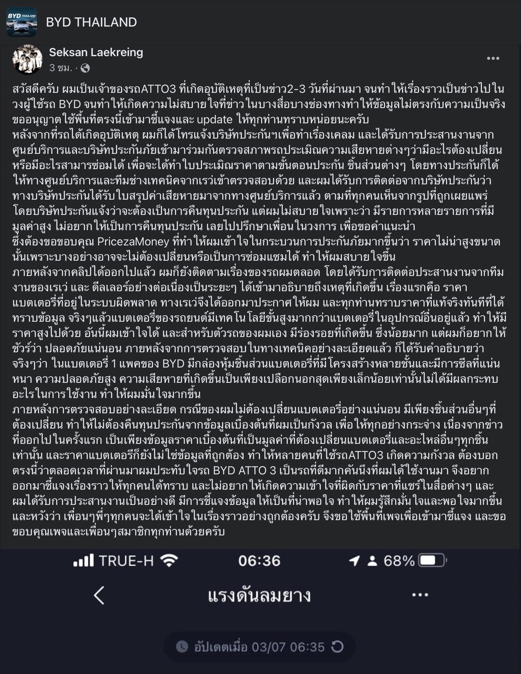 และล่าสุดเจ้าของรถยนต์ไฟฟ้าคันดังกล่าวได้ออกมาชี้แจงถึงเรื่องที่ได้เกิดขึ้น ในกลุ่ม BYD THAILAND ในกรณีราคาแบตเตอรี่ที่มีราคาแพง เนื่องจากระบบได้แจ้งราคาค่าซ่อมแบตเตอรี่นั้นผิดพลาด แม้จะมีรอยถลอกตรงเคสของแบตเตอรี่ ซึ่งท้ายที่สุดแล้วก็เปลี่ยนแค่ตัวเคสหุ้มแบตเตอรี่เพียงเท่านั้น แต่รอยถลอกดังกล่าวก็ไม่ทำให้แบตเตอรี่เกิดความเสียหายรุนแรงและสามารถใช้งานรถคันนี้ได้ปกติ