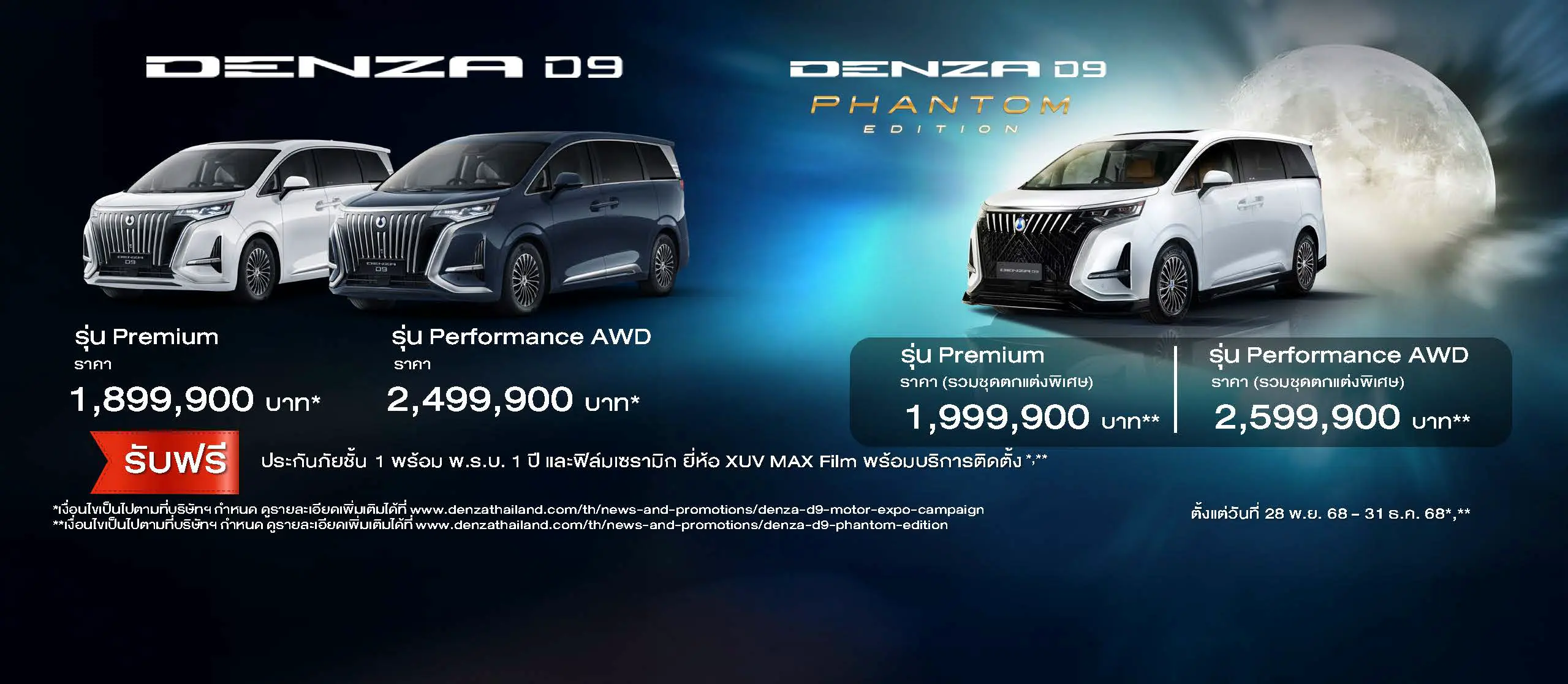 - DENZA D9 Phantom Edition ราคาพิเศษ 1,999,900 บาท1 ในรุ่น Premium หรือ 2,599,900 บาท1 ในรุ่น AWD Performance