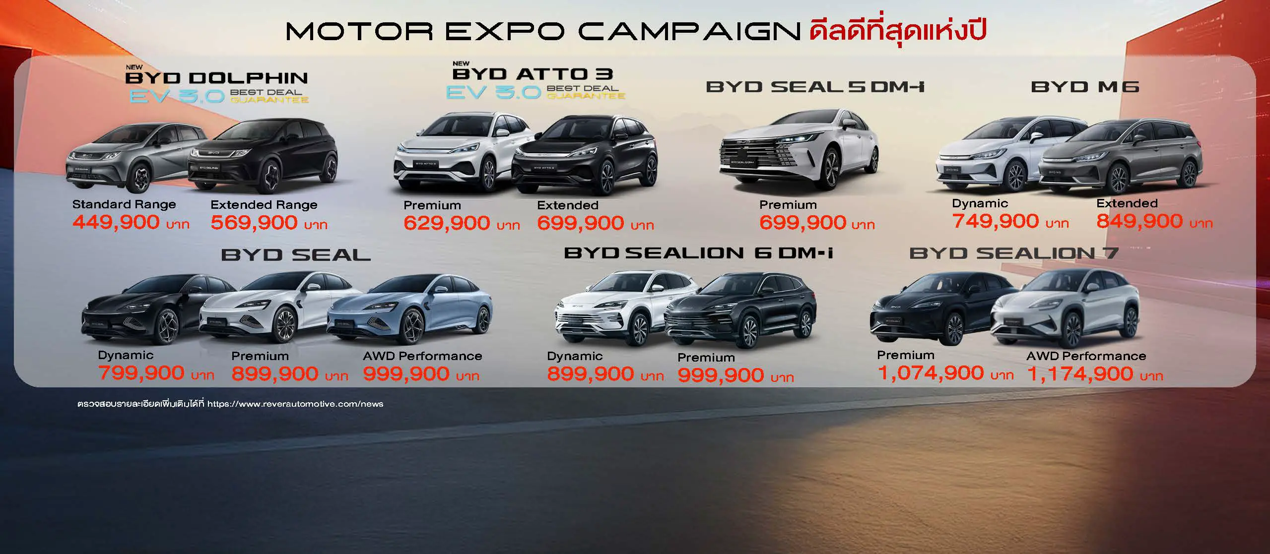 อย่าพลาดโอกาสสุดท้าย ในการรับข้อเสนอดีที่สุดเท่าที่เคยมีมา ในการเป็นเจ้าของรถยนต์ บีวายดี และ เดนซ่า พบกับรถยนต์พลังงานใหม่จาก บีวายดี ที่โชว์รูมและศูนย์บริการ บีวายดี และ เดนซ่า ทั้ง 167 สาขาทั่วประเทศ ค้นหาข้อมูลเพิ่มเติมของรถยนต์ทุกรุ่นได้ที่ reverautomotive.com สำหรับรถยนต์ บีวายดี หรือ denzathai land.com สำหรับรถยนต์ เดนซ่า ไม่พลาดข่าวสารจาก เรเว่ เพียงติดตาม Official Facebook Page: BYD RÊVER Thailand และ DENZA RÊVER Thailand