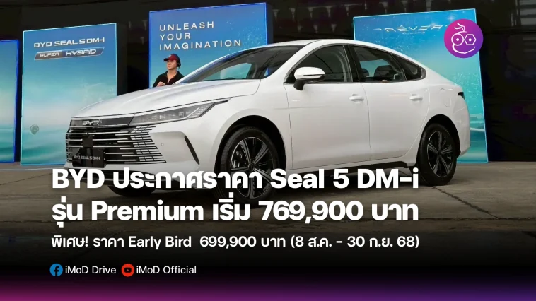 BYD SEAL 5 DM-i SUPER HYBRID ผลิตขึ้นที่โรงงาน บีวายดี ออโต้ ประเทศไทย มาพร้อม 2 รุ่นย่อยให้เลือก โดยมีราคา 769,900 บาท ในรุ่น PREMIUM และมีราคา Early Bird 699,900 บาท (ตั้งแต่วันที่ 8 สิงหาคม – 30 กันยายน 2568)