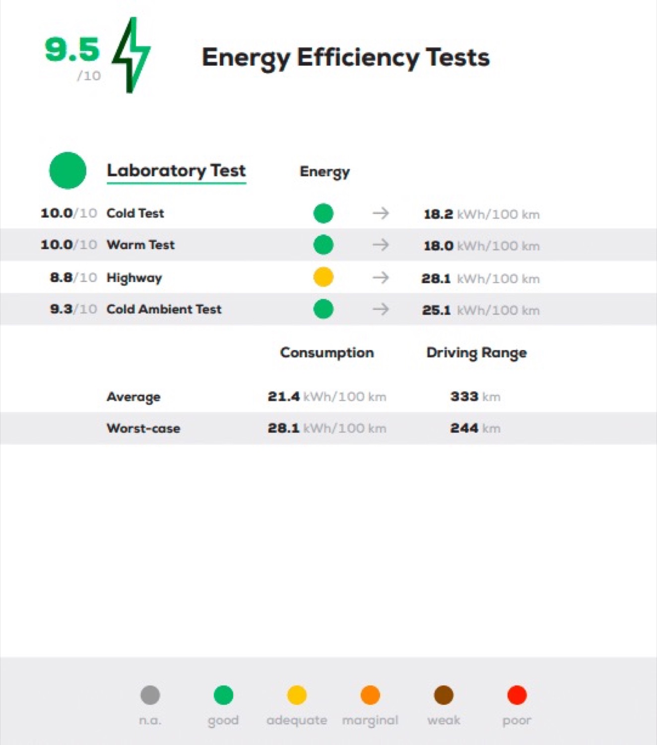 การทดสอบขับขี่บนทางหลวงพบว่า อัตราการใช้พลังงานค่อนข้างสูง อยู่ที่ 28.1 kWh/100km คิดเป็นระยะ 244 กม. ส่วนการขับขี่ On-Road Drive ด้วยอุณหภูมิ 19 องศาเซลเซียส ได้ทดสอบที่ความเร็ว 18kWh/100km สามารถวิ่งได้ 376 กม.