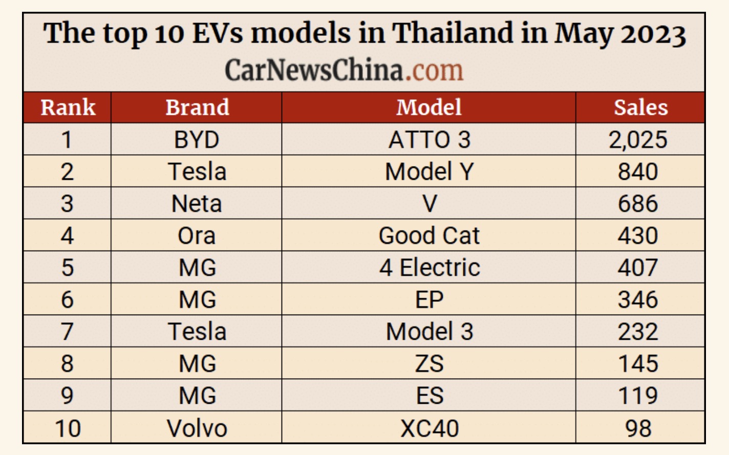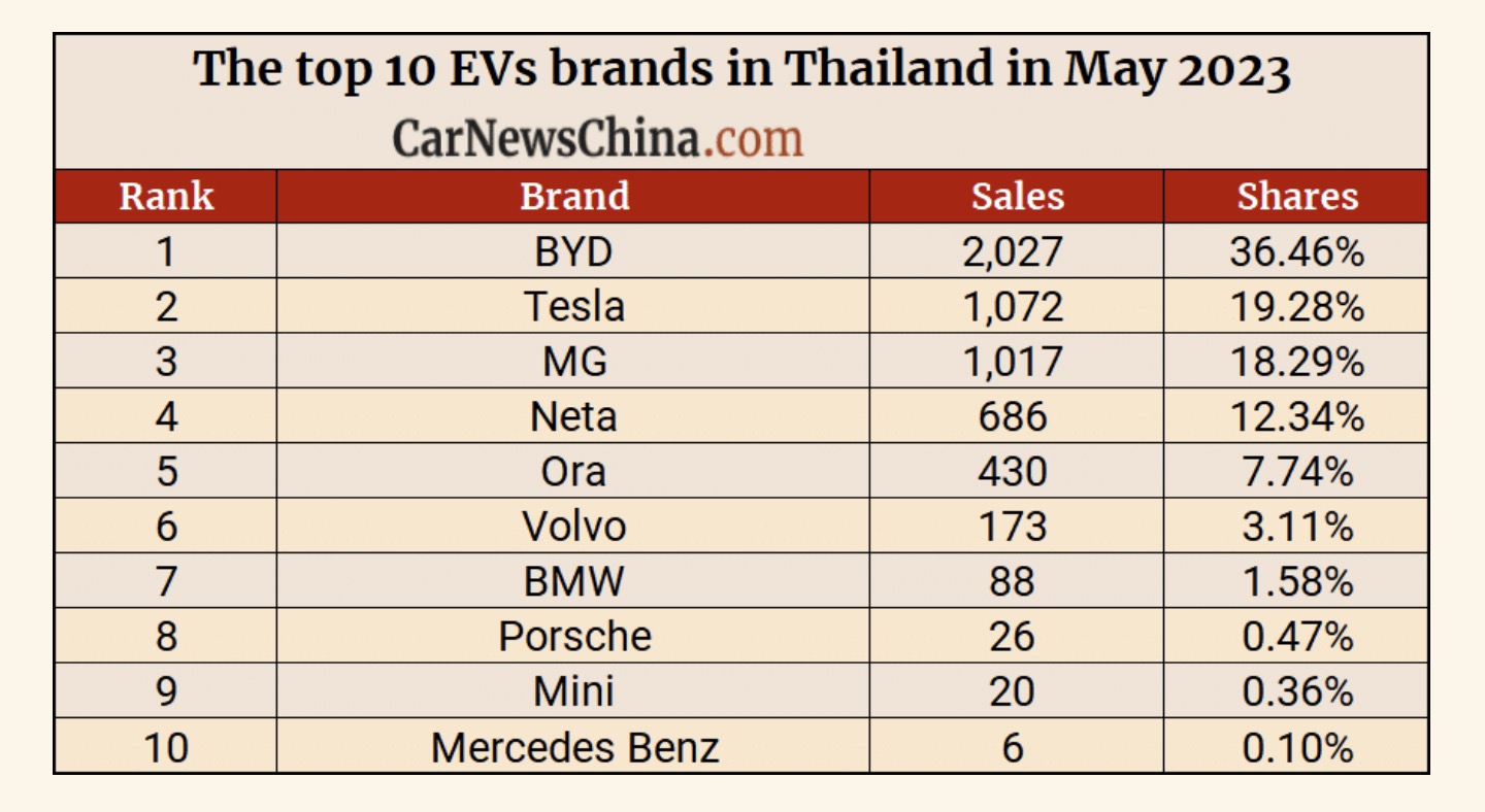 ในเดือนพฤษภาคม 2023 พบว่า แบรนด์รถยนต์ไฟฟ้า (EV) ที่ขายดีที่สุด 5 อันดับแรกในประเทศไทย ได้แก่ BYD, Tesla, MG, Neta และ ORA โดย BYD ครองตำแหน่งสูงสุดด้วยจำนวนยอดขาย 2,027 คัน, Tesla 1,072 คัน, MG 1,017 คัน, Neta 686 คัน และ Ora 430 คัน ทำให้ BYD ยังคงครอบแชมป์ยอดขายติดต่อกันถึง 6 เดือน นับตั้งแต่ขึ้นเป็นที่หนึ่งในเดือนธันวาคม 2022