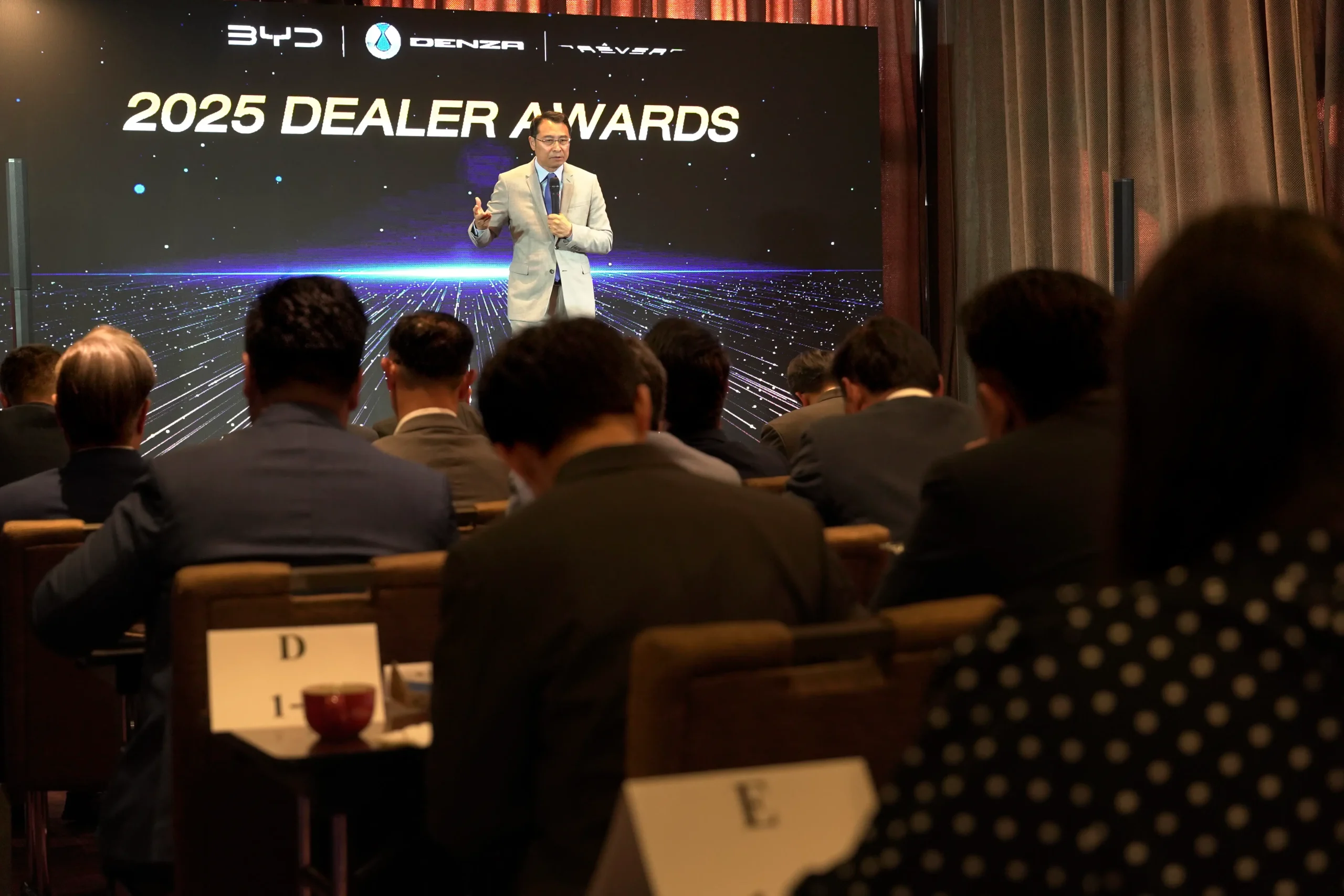 พร้อมกันนั้น ยังเป็นการแสดงความขอบคุณกลุ่มผู้จำหน่าย ที่มีส่วนสำคัญในการขับเคลื่อนความสำเร็จของรถยนต์ บีวายดี ในประเทศไทย จนมีอัตราเติบโตอย่างต่อเนื่อง ทั้งยังเป็นหน้าด่านสำคัญในการสร้างประสบการณ์ใหม่และความพึงพอใจ ให้แก่ผู้บริโภคที่ไว้วางใจเลือกใช้รถยนต์ บีวายดี และ เดนซ่า ในพิธีมอบรางวัล มีผู้บริหารร่วมแสดงความยินดี พร้อมเป็นตัวแทนในการมอบรางวัล ดังรายนามต่อไปนี้