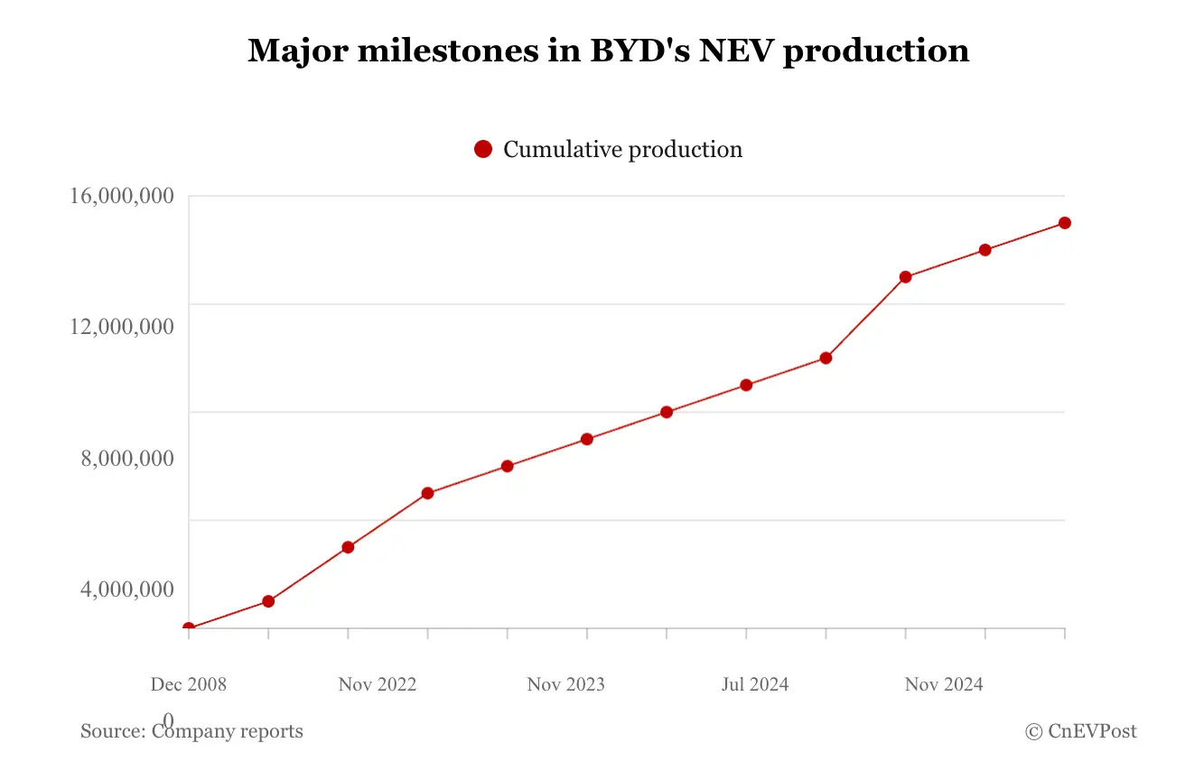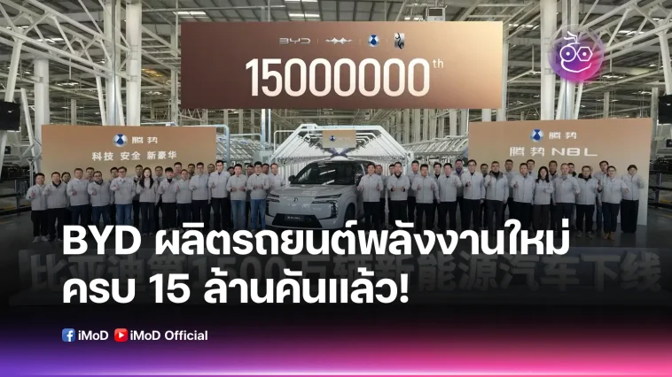 BYD ผู้ผลิตรถยนต์พลังงานใหม่ (NEV) รายใหญ่จากประเทศจีน ได้ประกาศความสำเร็จครั้งสำคัญด้วยการผลิตรถยนต์ออกจากสายพานการผลิตครบ 15 ล้านคันแล้ว โดยทางบริษัทได้ประกาศข่าวนี้ผ่านทาง Weibo ว่ารถคันที่ 15 ล้านคือรุ่น Denza N8L ซึ่งเป็นรถ SUV จากแบรนด์ระดับพรีเมียมในเครือ และยังถือเป็นรถรุ่นนี้คันที่ 15,000 อีกด้วย