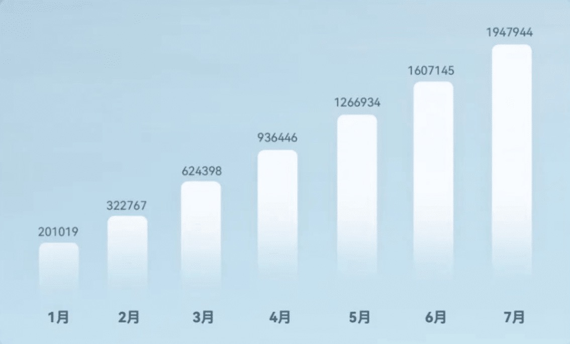 BYD ทำยอดขายสะสมได้ 342,383 คัน ในเดือนกรกฎาคมที่ผ่านมา โดยมีรถยนต์นั่งส่วนบุคคลถึง 340,799 คัน เพิ่มขึ้น 30.5% เมื่อเทียบรายปี ส่วนยอดขายสะสมรถยนต์นั่งส่วนบุคคลตั้งแต่ต้นปีมาจนถึงเดือนกรกฏาคมขายได้ถึง 1,947,944 คัน นอกจากนี้ยอดขายสะสมทั้งหมด BYD ขายรถยนต์พลังงานใหม่ได้มากกว่า 8.3 ล้านคัน คาดว่ารถคันที่ 9 ล้านจะออกจากสายการผลิตช่วงเดือนตุลาคมปีนี้