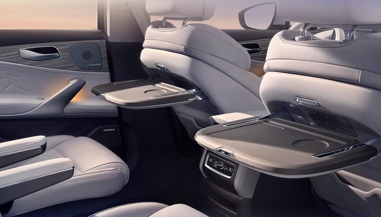 ที่นั่งแถวที่สอง ของ Denza N8 มีโต๊ะทานข้าวหรือโต๊ะทำงานแบบพับได้ด้วย ระบบเสียงของรุ่นดังกล่าว มาจาก Dynaudio