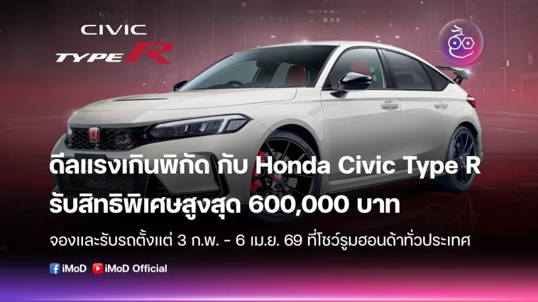ข้อเสนอพิเศษ กับแคมเปญ “Civic Type R – Unrivaled Performance” รับสิทธิพิเศษมูลค่าสูงสุด 600,000 บาท เมื่อจองและรับรถตั้งแต่ 3 ก.พ. – 6 เม.ย. 69 ที่โชว์รูมฮอนด้าทั่วประเทศ