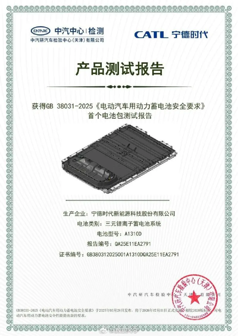 รายงานการทดสอบดังกล่าว ออกโดยศูนย์วิจัยและเทคโนโลยียานยนต์แห่งประเทศจีน (CATARC) ซึ่งเป็นองค์กรที่มีชื่อเสียงในด้านการทดสอบและรับรองผลิตภัณฑ์ นอกจากนี้ CATARC ยังเป็นผู้ดำเนินการทดสอบความปลอดภัยรถยนต์ C-NCAP ในประเทศจีนอีกด้วย โดยในพิธีมอบใบรับรอง มีตัวแทนจากกรมพลังงานของ CATARC และศูนย์ทดสอบของ CATL เข้าร่วมด้วย