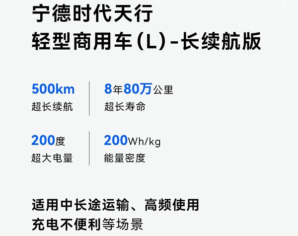 นอกเหนือจากชุดแบตเตอรี่ทั้งสองนี้แล้ว โซลูชัน Tianxing L series ยังรองรับชุดที่มีความจุ 30 kWh ถึง 200 kWh และให้ระยะทางที่วิ่งได้ 150 กม. ถึง 500 กม. CATL กล่าว