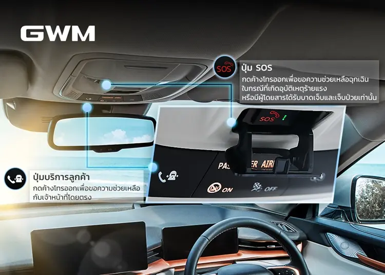 หลากหลายสถานการณ์ที่ไม่คาดคิดมักเกิดขึ้นได้จริง เกินความคาดหมาย เช่น อาการหน้ามืดขณะขับรถ หรือรถเสียการทรงตัวและไถลลงข้างทางในคืนฝนตก หรือหมอกลงหนาทัศนวิสัยไม่ดี ขณะขับรถเที่ยวบนดอยสูง ระบบความช่วยเหลือภายในรถยนต์ เกรท วอลล์ มอเตอร์ ที่ผ่านการคิดค้นมาอย่างรอบด้านและรอบคอบ สามารถช่วยเหลือทุกคนในห้องโดยสาร โดยเฉพาะอย่างยิ่งกับ 2 ปุ่ม ทั้ง ปุ่ม SOS และ ปุ่ม Call Center ที่ช่วยเหลือและสามารถช่วยกู้สถานการณ์ฉุกเฉินได้อย่างทันท่วงที โดยทั้ง 2 ปุ่มนี้ คือนวัตกรรมที่ถูกติดตั้งไว้ในรถยนต์พลังงานใหม่ของ เกรท วอลล์ มอเตอร์ ทุกคัน โดย ปุ่ม SOS จะเป็นการกดโทรออกเพื่อขอความช่วยเหลือในกรณีฉุกเฉิน หรือในกรณีเกิดอุบัติเหตุร้ายแรงจนถุงลมนิรภัยแตก โดยระบบจะแจ้งพิกัดของตัวรถไปยังหน่วยงานฉุกเฉินทันที เพื่อให้เจ้าหน้าที่ได้เข้าไปช่วยเหลือผู้ขับขี่และผู้โดยสารได้อย่างทันท่วงที นอกจากนี้ยังมาพร้อม ปุ่ม Call Center หรือปุ่มบริการลูกค้า ที่ผู้ขับขี่สามารถกดโทรออกเพื่อขอความช่วยเหลือไปยังเจ้าหน้าที่ Call Center โดยตรง มอบความอุ่นใจให้กับผู้ใช้งานรถยนต์พลังงานใหม่ของ เกรท วอลล์ มอเตอร์ มากยิ่งขึ้น