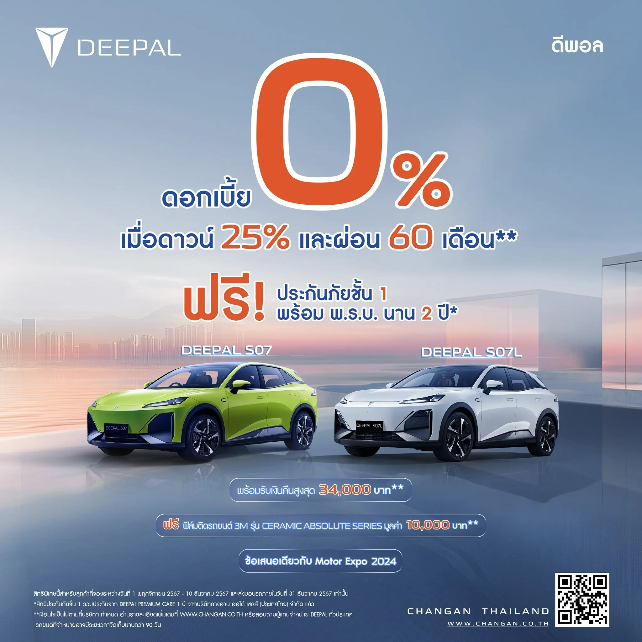 โดยแคมเปญสุดพิเศษในช่วง Motor Expo 2024 และช่วงสิ้นปีที่กำลังจะมาถึง มอบสิทธิพิเศษให้กับลูกค้าทุกท่านที่ซื้อรถยนต์ DEEPAL S07, DEEPAL S07 L และ DEEPAL L07 สุดคุ้ม! รับโปรโมชั่น 2 ต่อดังนี้