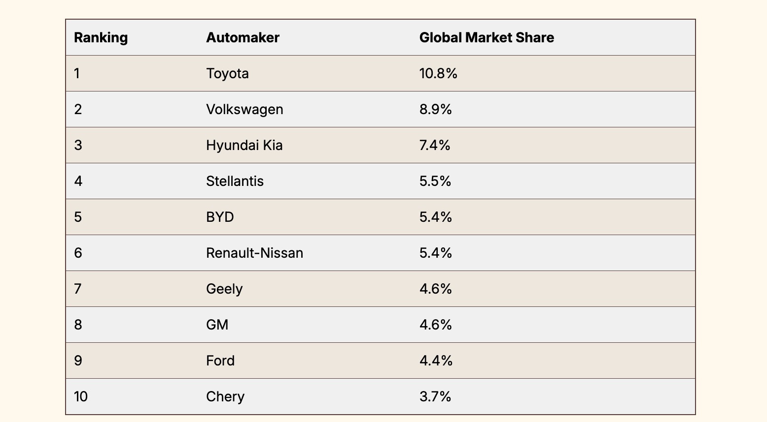 ในบรรดาผู้ผลิตรถยนต์รายใหญ่ที่สุด 10 อันดับแรกของโลก มีบริษัทจากจีนติดอันดับถึง 3 ราย ได้แก่ BYD (อันดับ 5), Geely (อันดับ 7) และ Chery (อันดับ 10)