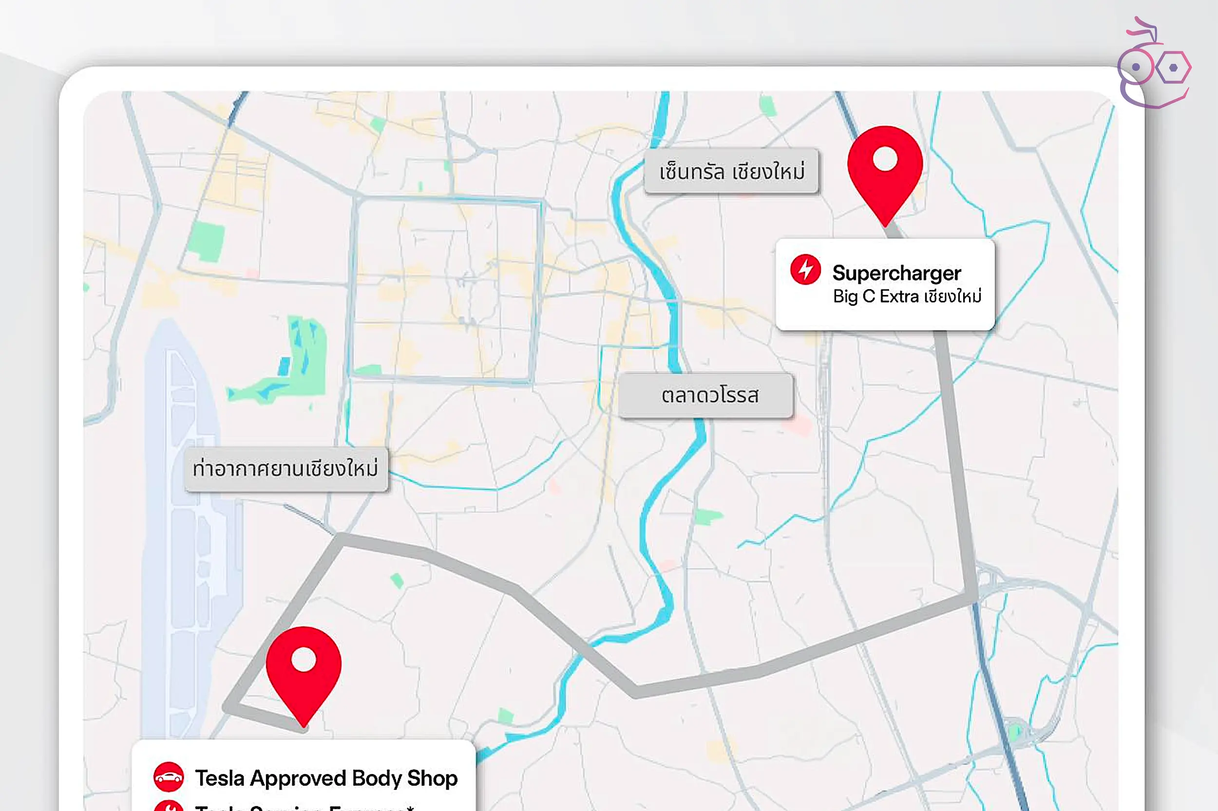 อยู่ห่างจากสนามบินเชียงใหม่เพียง 15 นาที เพื่อรับรองลูกค้า Tesla ที่อาศัยอยู่ในจังหวัดเชียงใหม่และจังหวัดใกล้เคียงให้เข้ามารับบริการซ่อมบำรุงรถ Tesla ได้อย่างสะดวกสบายและครอบคลุมมากขึ้น