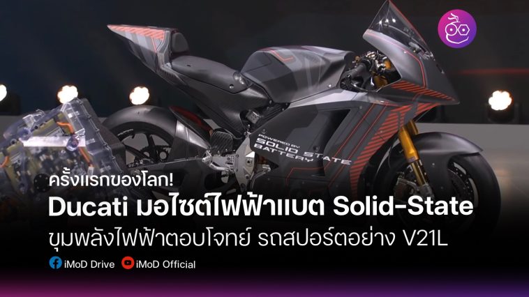 คันนี้คือ Ducati V21L รถแข่งที่ดัดแปลงมาเพื่อโชว์ในงานเปิดตัว ถือเป็นครั้งแรกที่รถมอเตอร์ไซค์ 2 ล้อวิ่งด้วยเซลล์ Solid-State ในงานได้นำรถคันนี้ขับโชว์ออกมาแสดงให้เห็นถึงการก้าวกระโดดด้านงานวิจัยในห้องแล็บสู่การใช้งานจริง พร้อมตอกย้ำตำแหน่งของ Ducati ในฐานะผู้นำด้านการไฟฟ้าที่เน้นสมรรถนะสูง