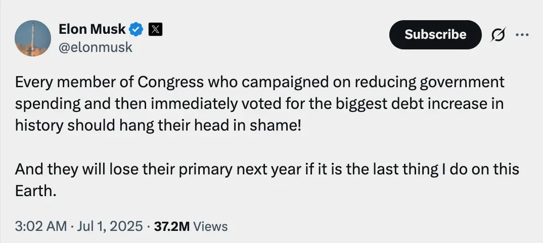 ความขัดแย้งครั้งที่ 2 ระหว่างทั้งสองได้เริ่มต้นขึ้นเมื่อวันจันทร์ที่ผ่านมา เนื่องจาก Musk ยังคงคัดค้าน “ร่างกฎหมาย Big Beautiful Bill” ที่รัฐบาล Trump พยายามผลักดันให้เป็นกฎหมาย โดย Musk ประมาณการว่าร่างกฎหมายนี้จะเพิ่มค่าใช้จ่ายและย้อนกลับงานที่ DOGE ได้ทำไป เพื่อลดการขาดดุล