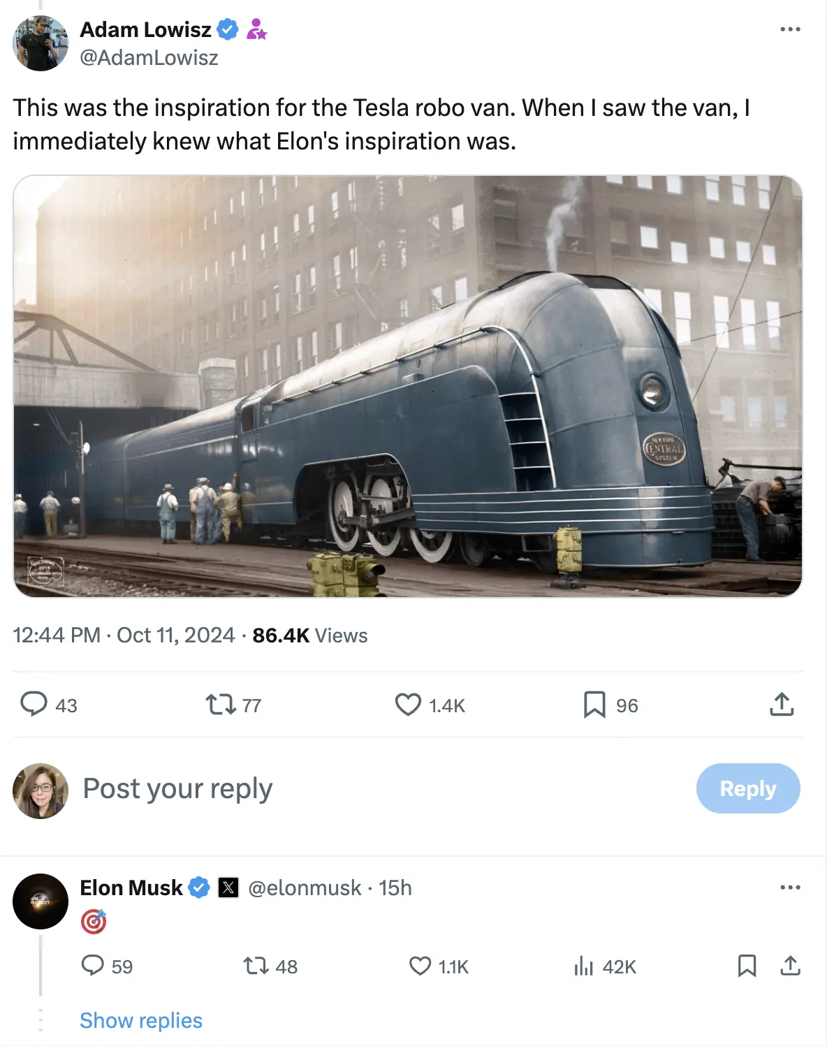 Elon Musk ได้ตอบกลับว่า “Robovan ได้รับแรงบันดาลใจจากรถไฟ Art Deco ที่เคยได้รับความนิยมในช่วงทศวรรษที่ 1930” เมื่อเทียบกันแล้วก็มีลักษณะคล้ายกับรถไฟ Art Deco จริง โดยคล้ายกับรถไฟ Mercury Streamliner ที่ใช้ในปี 1936