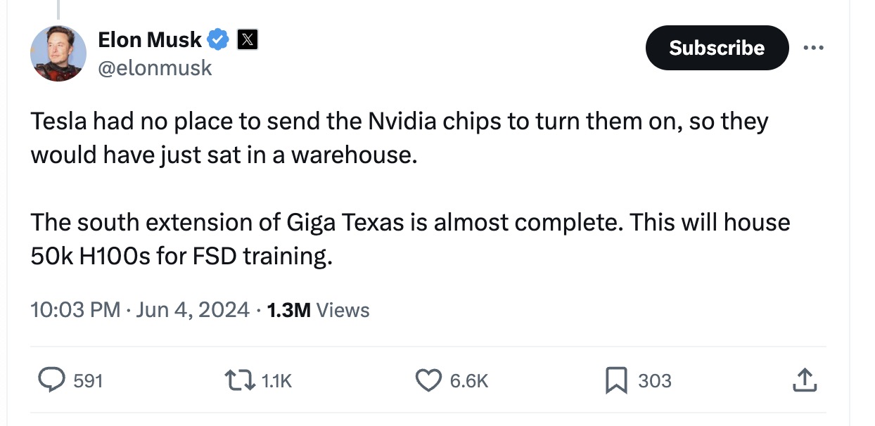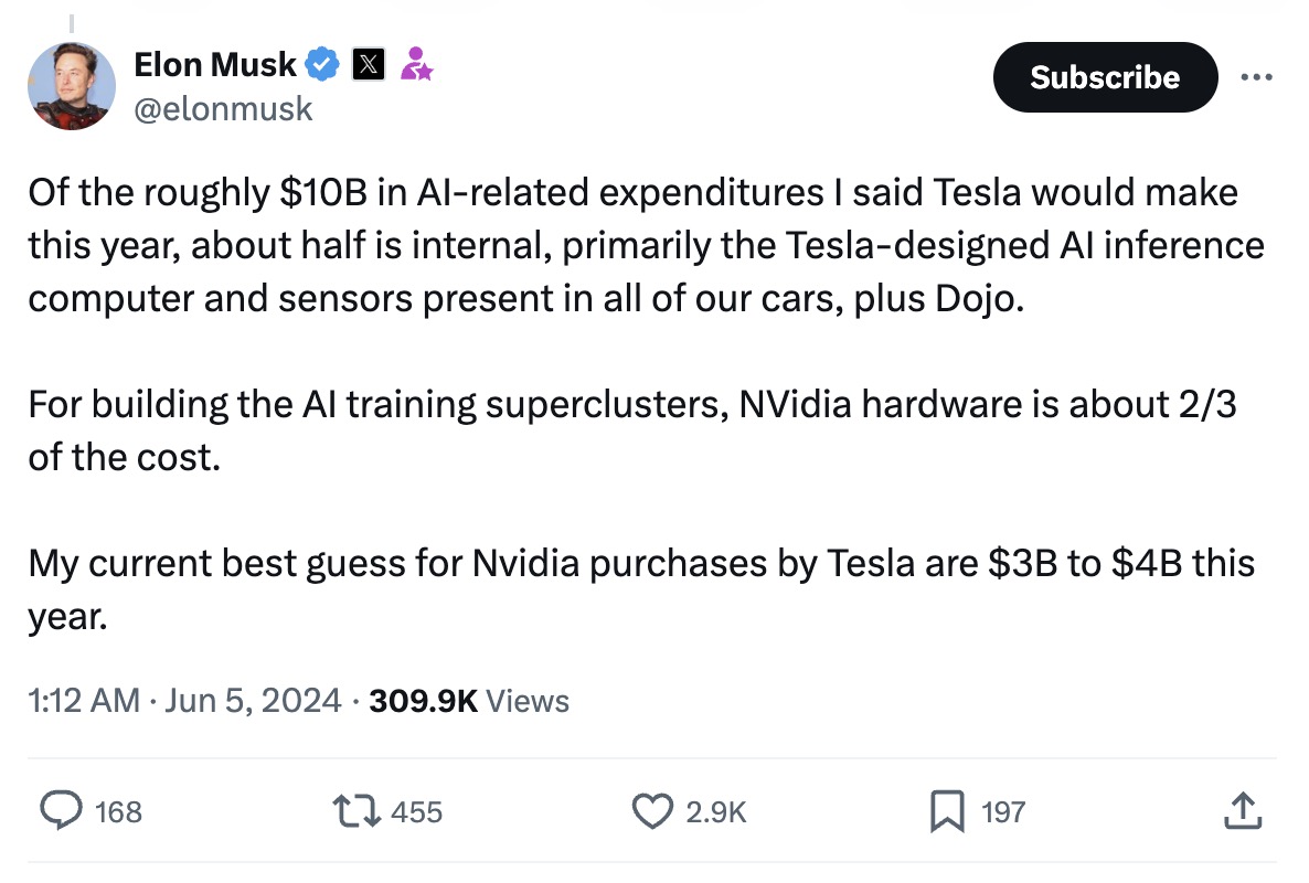 นอกจากนี้ Musk ยังได้โพสต์ข้อมูลบน X เกี่ยวกับการซื้อชิป Nividia ของ Tesla ในปีนี้ว่า เขาคาดว่าการซื้อชิปจะมีมูลค่า 3-4 พันล้านดอลลาร์สหรัฐฯ