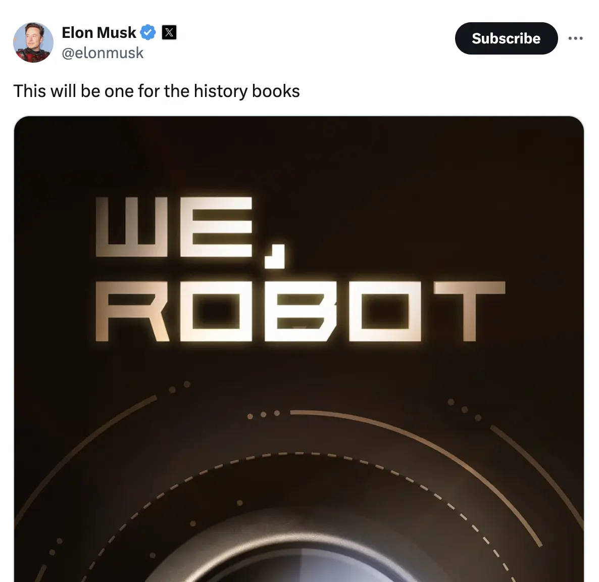 เมื่อไม่นานมานี้ Elon Musk เผยว่า งานนี้อาจจะเป็นงานที่ใหญ่ที่สุดของ Tesla นับตั้งแต่มีการเปิดตัวรถยนต์รุ่น Model 3 เมื่อหลายปีก่อน ซึ่ง Tesla ได้เริ่มส่งคำเชิญร่วมงานการเปิดตัว Robotaxi ไปยังผู้ถือหุ้นและสื่อมวลชลอย่างต่อเนื่อง ใช้ชื่อว่า We, Robot และเขาระบุว่างานนี้จะเป็นหนึ่งในงานประวัติศาสตร์ที่ยิ่งใหญ่ที่สุดของ Tesla