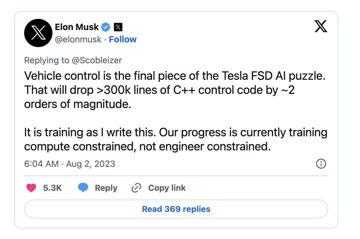 ล่าสุด Elon Musk ก็ได้รีทวีตใน X ว่า การควบคุมยานพาหนะคือส่วนสุดท้ายของระบบขับเคลื่อนอัตโนมัติเต็มรูปแบบหรือ Full Self-Driving ของ Tesla และคาดว่า Tesla ใช้โครงข่ายประสาทเทียมในการควบคุมยานพาหนะมากกว่าการสั่งงานด้วยชุดคำสั่ง (Code) โดยตรง