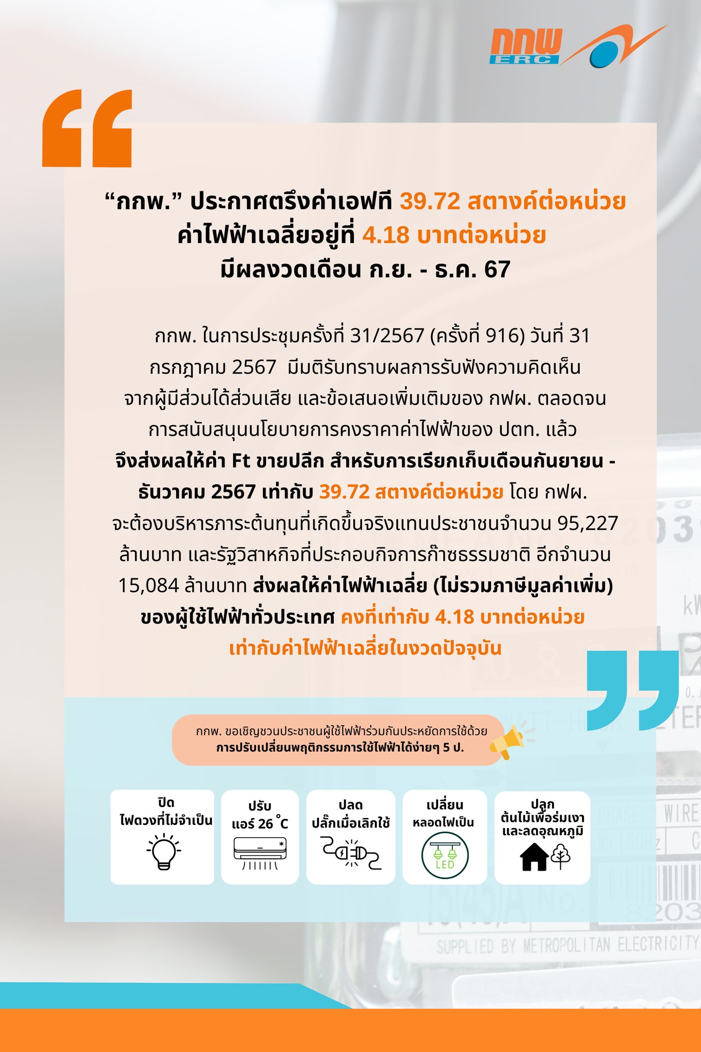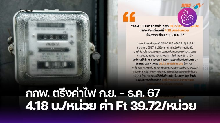 กกพ. ตรึงค่าไฟ 4.18 บาท/หน่วย ค่า Ft 39.72 สตางค์/หน่วย มีผลเดือนกันยายน – ธันวาคม 2567