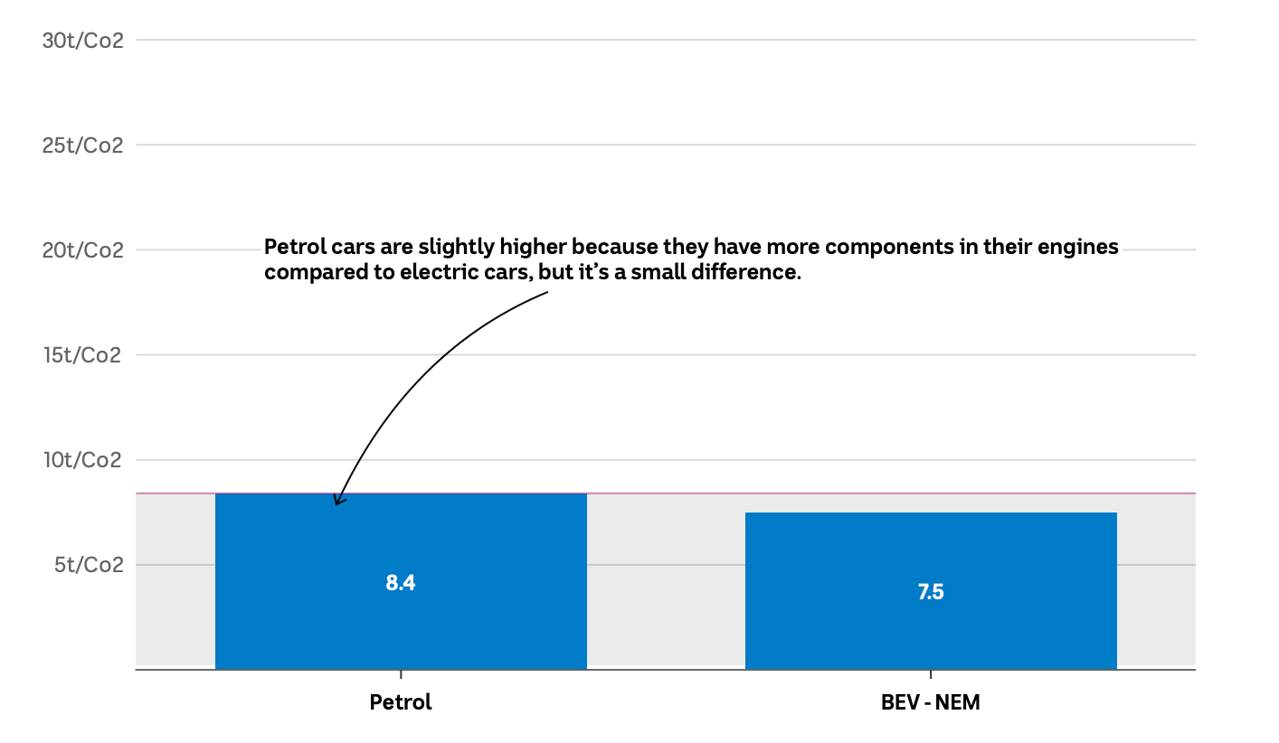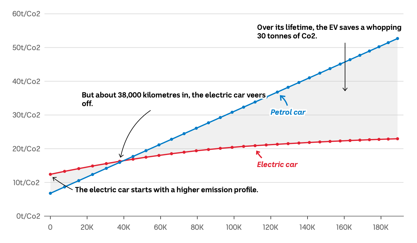 ทั้งหมดนี้หมายความว่ารถยนต์ที่ใช้น้ํามันเริ่มผลิตการปล่อยมลพิษมากขึ้นอย่างมีนัยสําคัญระหว่างการใช้งาน ทําให้รถยนต์ไฟฟ้าเทียบไม่ติดเลย