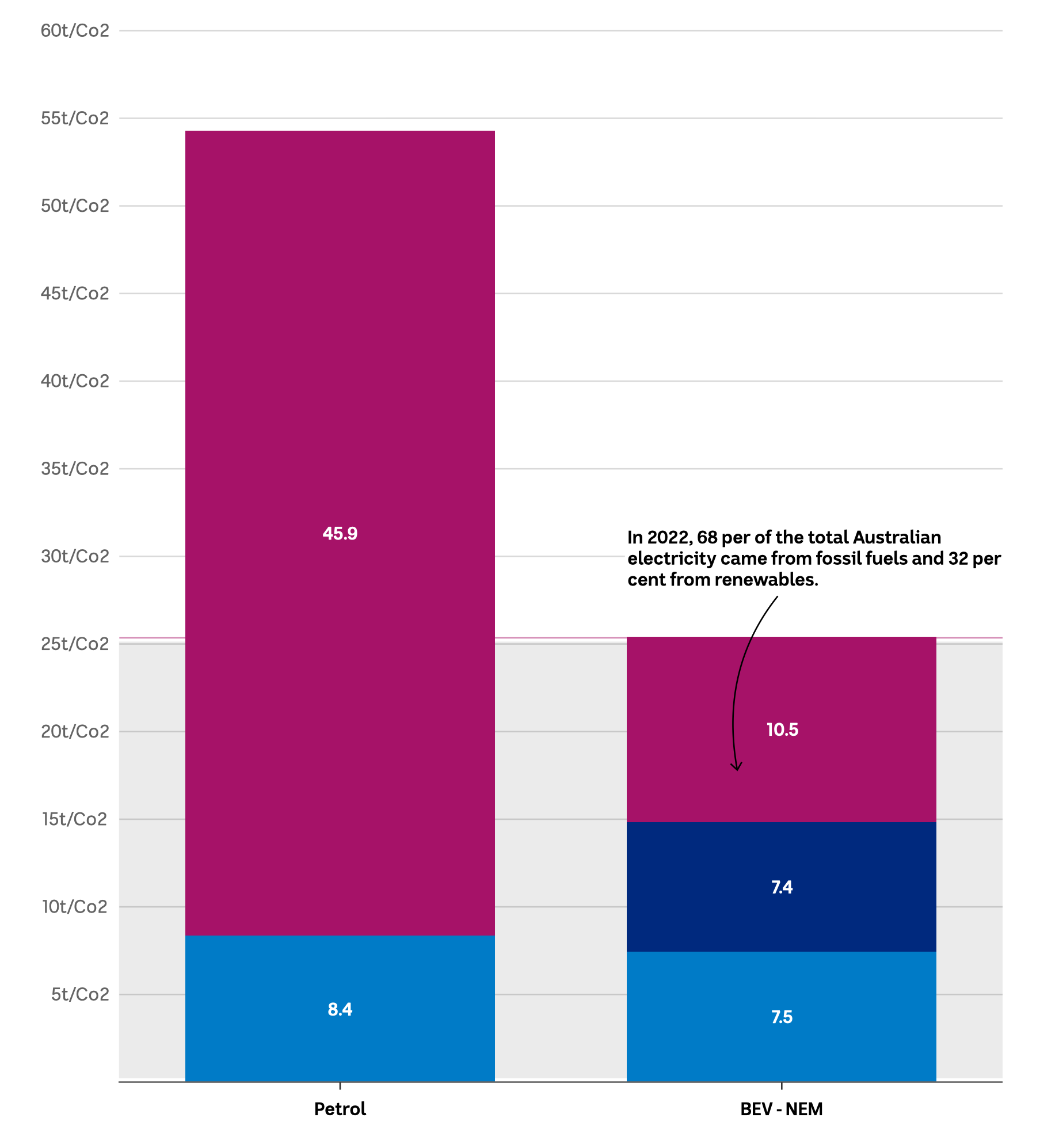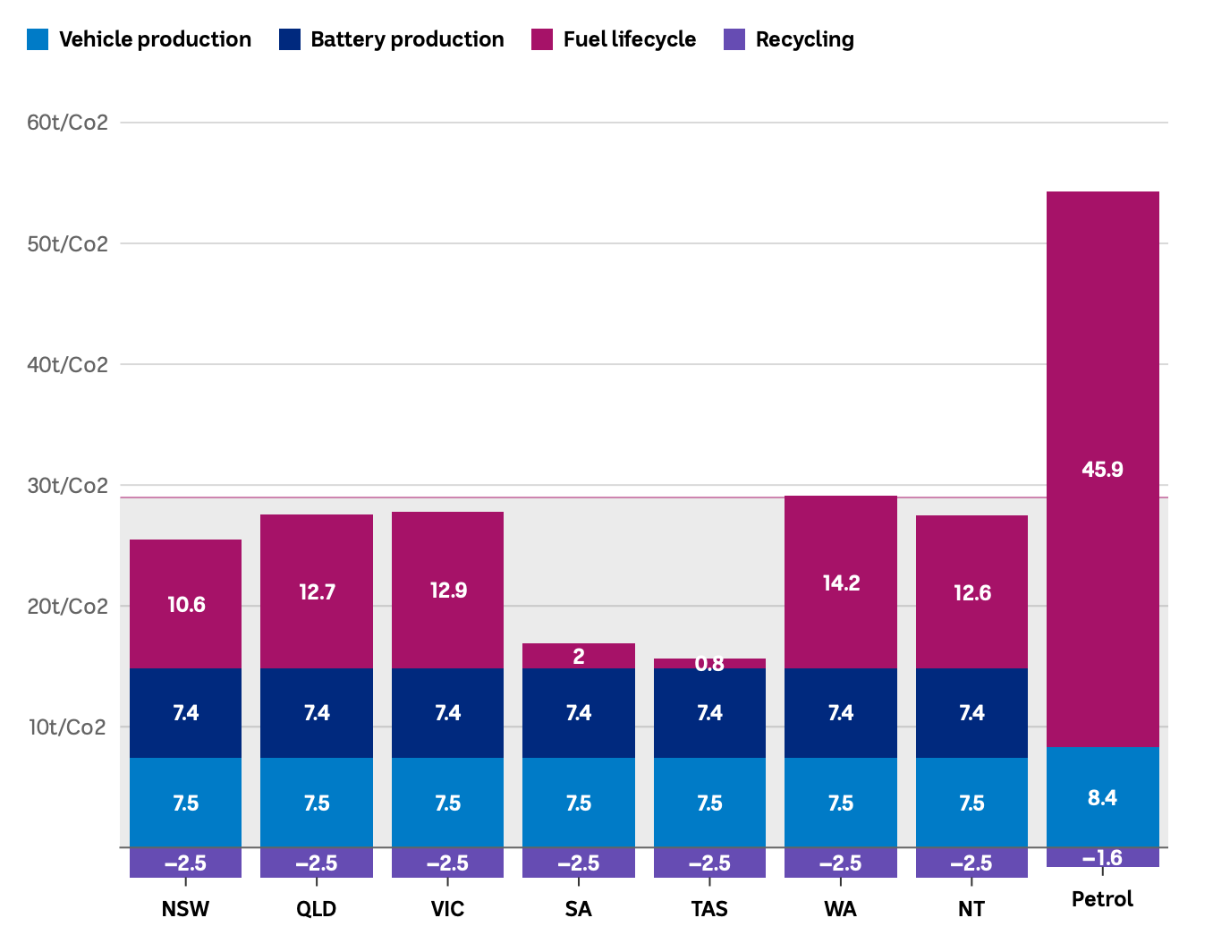 จากแบบจำลองที่ทำโดย Australian Energy Market Operator (AEMO) ซึ่งคาดการณ์อัตราของพลังงานหมุนเวียนใหม่ที่เข้าสู่กริดและโรงงานเชื้อเพลิงฟอสซิลที่ถูกปลดประจําการ นั่นคือ ภายในปี 2030 รถยนต์ไฟฟ้าคันเดียวกันจะผลิตการปล่อยมลพิษน้อยลง เนื่องจากจะถูกชาร์จด้วยพลังงานหมุนเวียนมากขึ้น