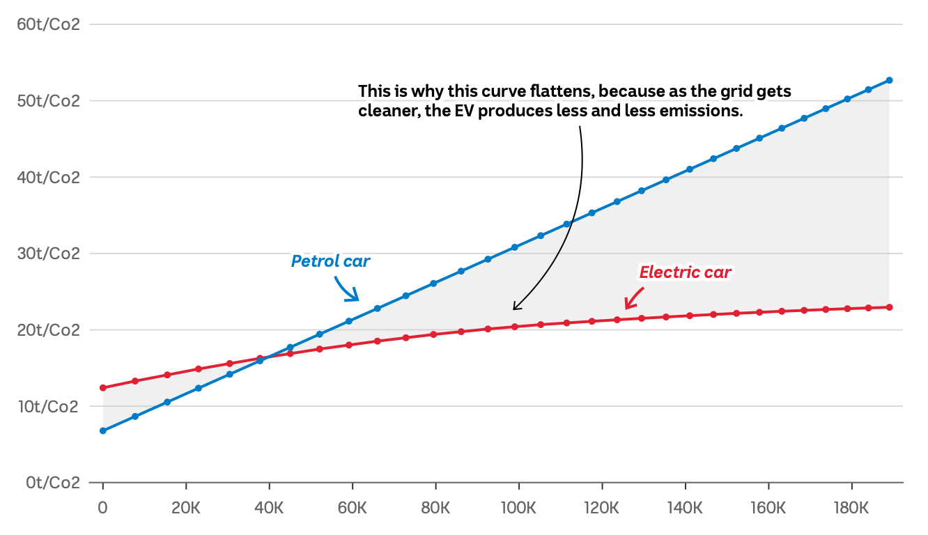 คุณสามารถเห็นการปล่อยมลพิษสําหรับรถน้ำมันเพิ่มขึ้นจนเริ่มกลายเป็นเส้นโค้งในการปล่อยมลพิษ แต่ทางรถยนต์ไฟฟ้ากําลังเริ่มแบนลง นั่นเป็นเพราะการชาร์จไฟฟ้าจากโครงข่ายไฟฟ้ากําลังเปลี่ยนแปลงอย่างรวดเร็วและพลังงานหมุนเวียนให้ได้ใช้งานมากขึ้นทำให้ปล่อยมลพิษน้อยลง