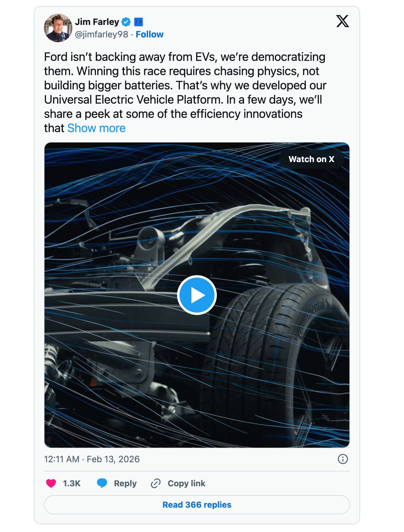 Farley โพสต์บนโซเชียลมีเดียว่า “Ford ไม่ได้ถอยจาก EV เรากำลังทำให้มันเข้าถึงได้ง่ายขึ้น การชนะการแข่งขันนี้ต้องไล่ตามฟิสิกส์ ไม่ใช่สร้างแบตเตอรี่ที่ใหญ่ขึ้น นั่นคือเหตุผลที่เราพัฒนา Universal Electric Vehicle Platform”