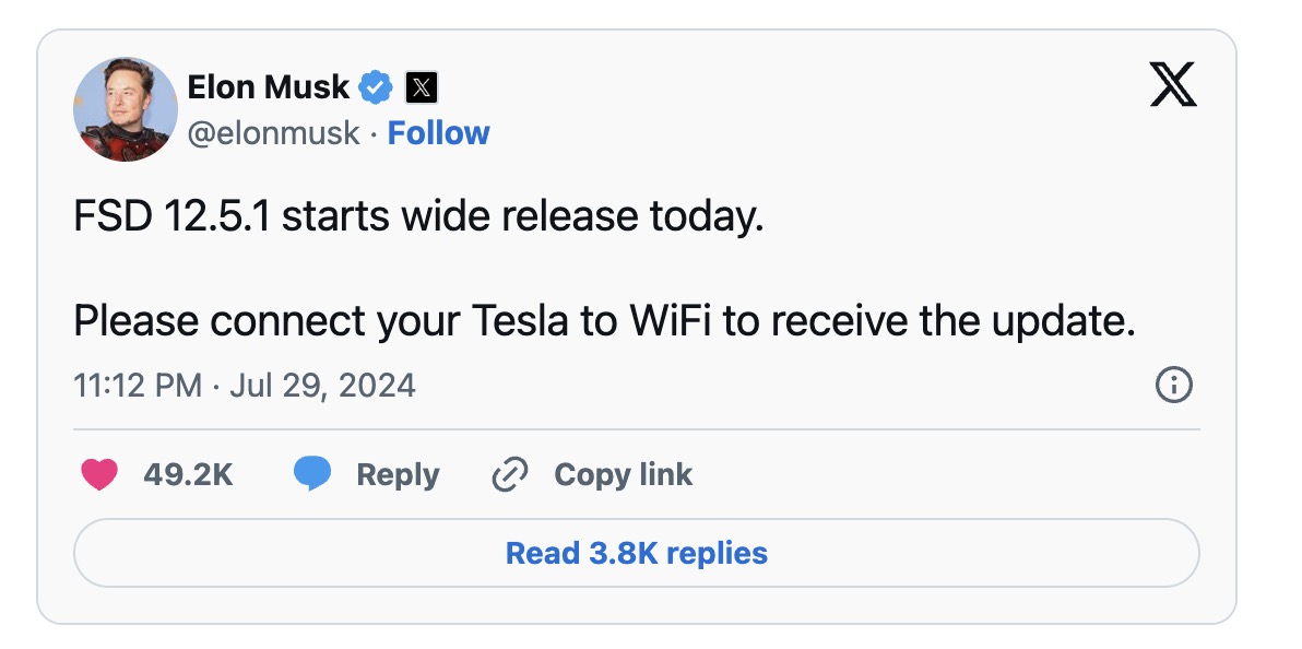 วันจันทร์ที่ผ่านมา Elon Musk ยืนยันว่าระบบ FSD Supervised เวอร์ชันล่าสุด V12.5.1 จะเริ่มเปิดให้อัปเดตในวงกว้างมากขึ้น รวมถึงเผยว่าจะเปิดให้ใช้กับรถยนต์ Model Y รุ่น HW4.0 ก่อนและจะขยายไปยังรถยนต์รุ่นอื่น ๆ ภายหลัง