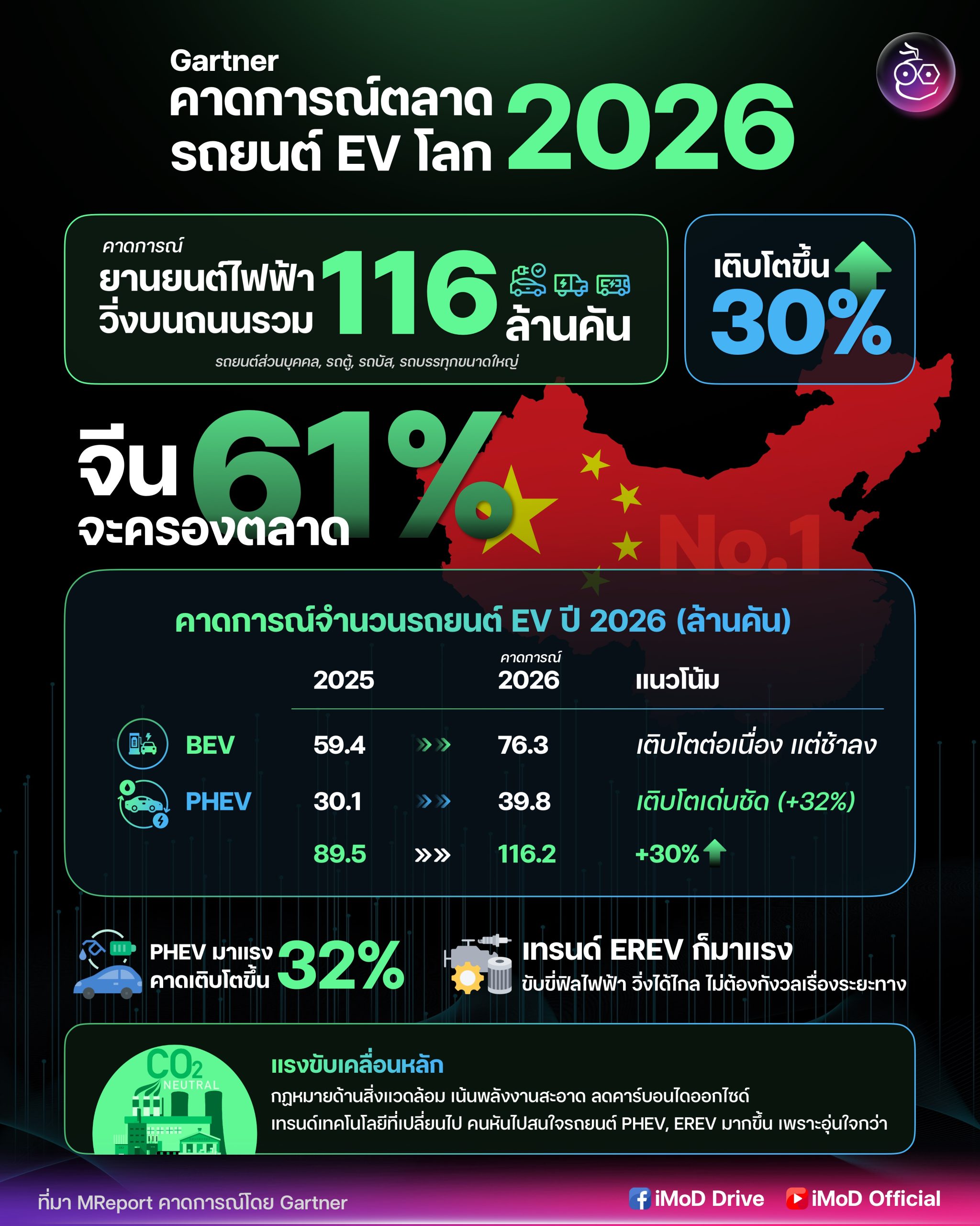 สุดท้ายแล้ว ตัวเลข 116 ล้านคัน อาจเป็นเพียงจุดเริ่มต้นของยุคใหม่ ยุคที่รถไฟฟ้าไม่ใช่ทางเลือก แต่เป็นทางรอดของสิ่งแวดล้อมโลก น่าจับตามองว่าท่ามกลางการแข่งขันที่ดุเดือดระหว่างค่ายรถ และความนิยมใน PHEV ที่พุ่งสูงขึ้น หน้าตาของท้องถนนในปี 2026 จะเปลี่ยนไปมากน้อยแค่ไหน