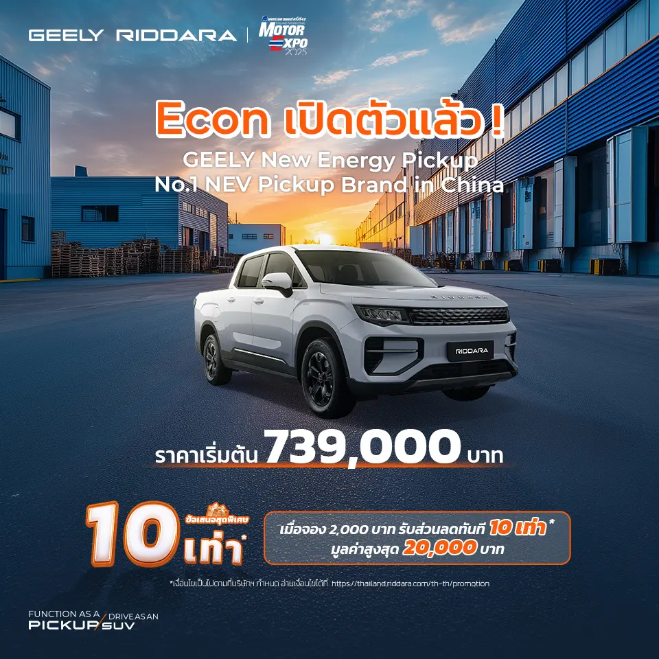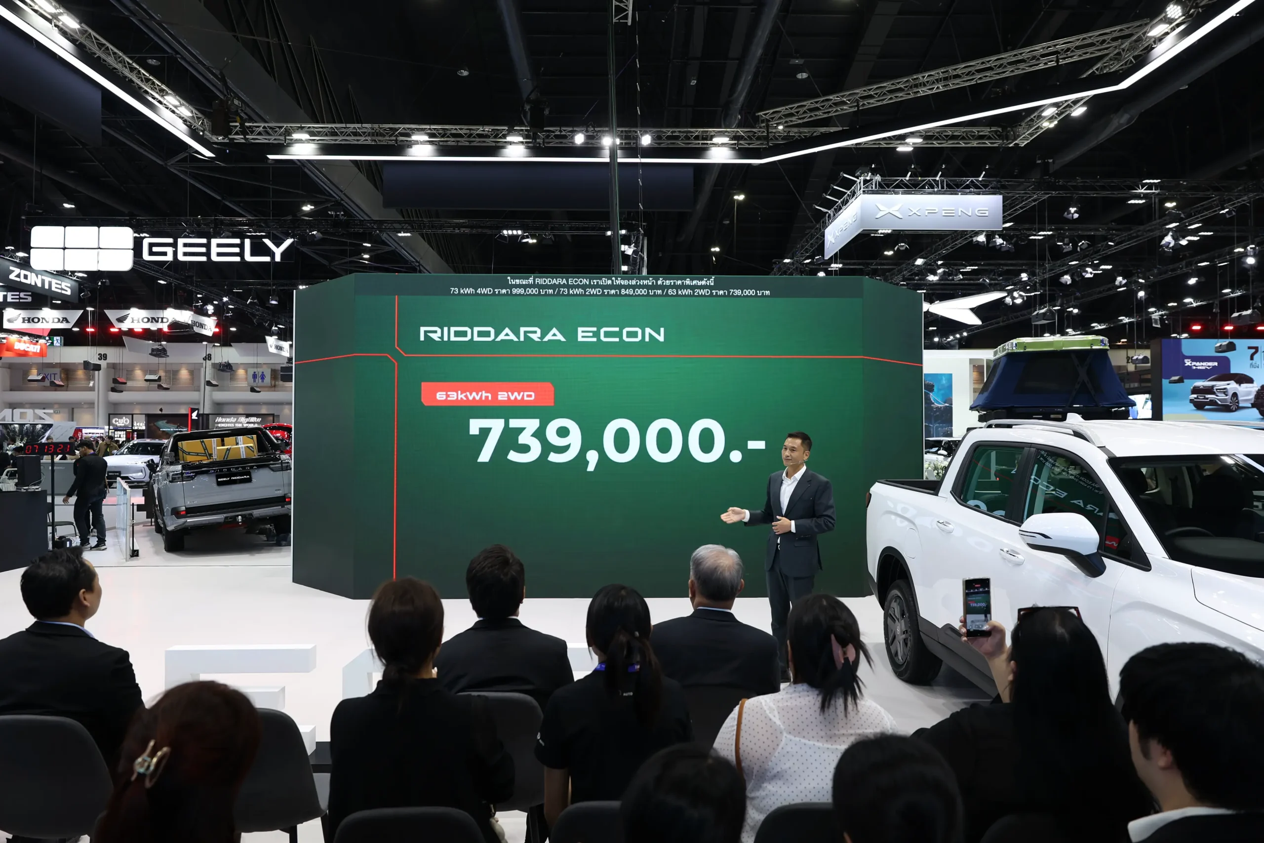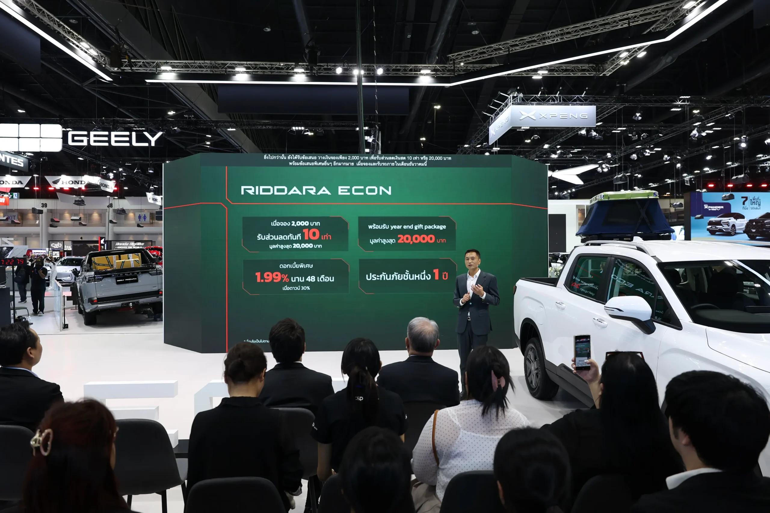 ทั้งนี้เพื่อเสริมสร้างความแข็งแกร่งให้กับอุตสาหกรรมยานยนต์ไทยและขยายการใช้งานรถกระบะพลังงานไฟฟ้า 100% ให้เติบโตอย่างกว้างขวาง GEELY RIDDARA จึงได้แนะนำ RIDDARA  ECON สู่ตลาดเมืองไทยเพื่อเพิ่มทางเลือกให้กับลูกค้ามากยิ่งขึ้น โดยจะเปิดรับจองอย่างเป็นทางการในงาน Motor Expo นี้เป็นต้นไป