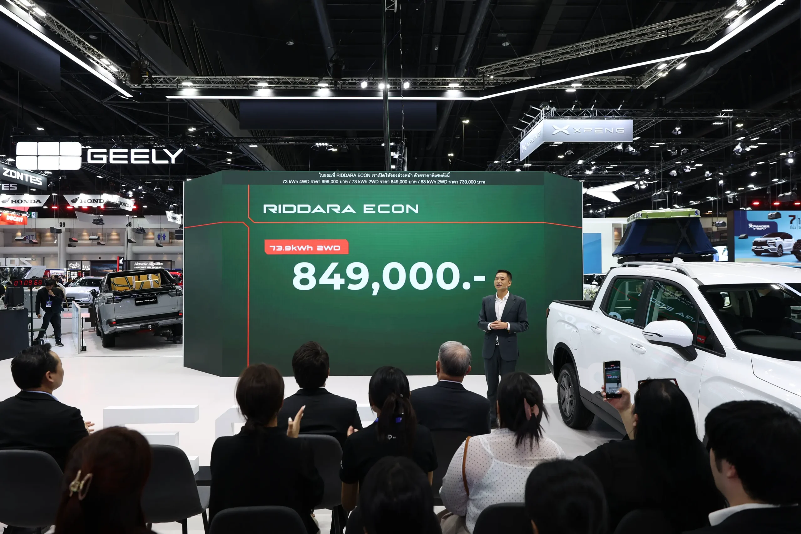 GEELY RIDDARA เปิดตัวรถกระบะไฟฟ้า RIDDARA ECON สำหรับกลุ่มการพาณิชย์ ในราคาเริ่มต้น 739,000 บาท พร้อมดีลส่วนลดเงินสดสูงสุด 120,000 บาท สำหรับลูกค้าที่จอง RD6 ทุกรุ่น นอกจากนี้ยังจัดแสดงนวัตกรรม OmniPower Stack และ PSP380 ซึ่งเป็นสถานีแปลงและจ่ายไฟอัจฉริยะที่เปลี่ยนรถกระบะให้เป็นสถานีพลังงานเคลื่อนที่ได้แบบครบวงจร